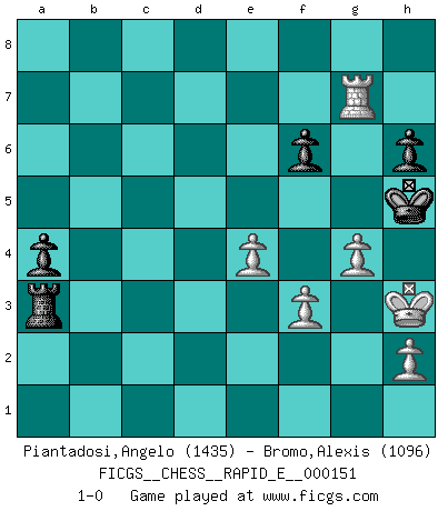 Last move : 1-0 2015 July 11 21:56:21 [Event "FICGS__CHESS__RAPID_E__000151"] [Site "FICGS"] [Date "2015.05.11"] [Round "1"] [White "Piantadosi,Angelo"] [Black "Bromo,Alexis"] [Result "1-0"] [WhiteElo "1435"] [BlackElo "1096"] 1.e4 e5 2.Nf3 Nc6 3.Bb5 d6 4.d4 Bd7 5.O-O h6 6.Nc3 a6 7.Ba4 Nf6 8.Re1 Be7 9.dxe5 dxe5 10.Bxc6 Bxc6 11.Qxd8+ Rxd8 12.Nxe5 Bd7 13.Nxd7 Rxd7 14.f3 O-O 15.Be3 Bb4 16.Rad1 Bxc3 17.bxc3 Rxd1 18.Rxd1 Re8 19.Bd4 Nd7 20.Bxg7 Ne5 21.Bxe5 Rxe5 22.Rd8+ Kg7 23.Rd7 Rc5 24.Rd3 Ra5 25.Rd7 Rxa2 26.Rxc7 Rxc2 27.Rxb7 Rxc3 28.Ra7 Ra3 29.Kf2 Kf6 30.Kg3 a5 31.Ra6+ Kg5 32.Ra7 f6 33.Rg7+ Kh5 34.Kh3 a4 35.g4+ 1-0 Ruy Lopez : Old Steinitz defense Kingside Castling by player White (move 5) Kingside Castling by player Black (move 14) Player White won this chess game. Follow this game move after move (download)Chess is a forcing house where the fruits of character can ripen more fully than in life. (Edward Morgan Foster) Ich könnte leicht behaupten: Ja,ja, Leonid Breschnew wollte nicht, daß ich Weltmeister werde. In der Tat war die Sache komplizierter. (Viktor Kortschnoi) La pasion por jugar al Ajedrez es una de las mas inexplicables en el mundo. (H.G. Wells) La vie et les Echecs sont tous les deux une lutte constante. (Lasker) The Internet is so big, so powerful and pointless that for some people it is a complete substitute for life. (Andrew Brown)