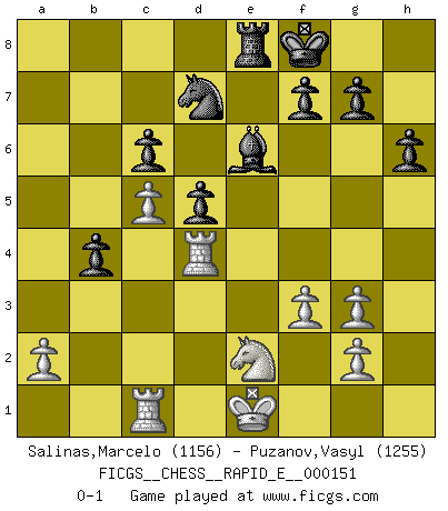 Last move : 0-1 2015 August 30 22:3:16 [Event "FICGS__CHESS__RAPID_E__000151"] [Site "FICGS"] [Date "2015.05.11"] [Round "1"] [White "Salinas,Marcelo"] [Black "Puzanov,Vasyl"] [Result "0-1"] [WhiteElo "1156"] [BlackElo "1255"] 1.e3 e5 2.Nc3 d5 3.Qh5 Nc6 4.Bb5 Qd6 5.d4 Nf6 6.Qxe5+ Be7 7.Qg5 O-O 8.Nf3 h6 9.Qg3 Qxg3 10.hxg3 Bd7 11.Ne5 Be8 12.Bxc6 bxc6 13.Ne2 Bd6 14.Rh4 Bxe5 15.dxe5 Nd7 16.e4 Nxe5 17.exd5 cxd5 18.Rd4 c6 19.Bf4 Ng6 20.Bd6 Bd7 21.Bxf8 Kxf8 22.c4 Be6 23.b3 a5 24.c5 Ne5 25.f3 Nd7 26.Rc1 Re8 27.b4 axb4 0-1 This chess game has been lost on time (started : 2015.05.11 2:40:38) Van't Kruijs Opening Kingside Castling by player Black (move 7) Player Black won this chess game. Follow this game move after move (download)It began to feel as though you were playing against Chess itself. - On playing against Robert Fischer. (Walter Shipman) Um sich vor der Gefahr einer Erkältung zu schützen, sorge der wanderlustige König beizeiten für ein brauchbares Versteck. (Aaron Nimzowitsch) ¿Cual es el objetivo de jugar una apertura de gambito?... Para adquirir una reputación de ser un jugador apuesto a costo de perder el juego. (Siegbert Tarrasch) Psychologiquement, tu dois avoir confiance en toi même, mais cette confiance doit être basée sur des faits. (Robert Fischer) Thus, what is of supreme importance in war is to attack the enemy's strategy. (Sun Tzu)