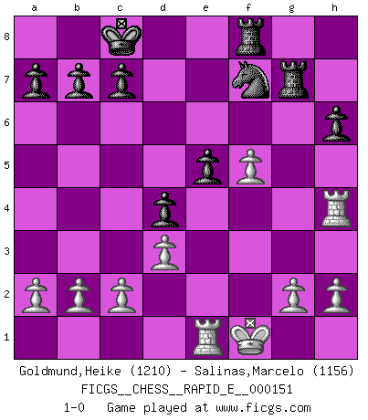 Last move : 1-0 2015 August 25 9:32:36 [Event "FICGS__CHESS__RAPID_E__000151"] [Site "FICGS"] [Date "2015.05.11"] [Round "1"] [White "Goldmund,Heike"] [Black "Salinas,Marcelo"] [Result "1-0"] [WhiteElo "1210"] [BlackElo "1156"] 1.e4 e5 2.Nf3 Nc6 3.Bc4 Qf6 4.O-O Nd4 5.Nxd4 exd4 6.d3 Qg6 7.Qf3 d6 8.Re1 Be6 9.Bxe6 fxe6 10.e5 O-O-O 11.Bf4 dxe5 12.Bxe5 Bb4 13.Re2 Ne7 14.Nd2 Rhf8 15.Qe4 Bxd2 16.Qxg6 Nxg6 17.Bxg7 Rf7 18.Rxd2 Rxg7 19.Re2 Nf4 20.Re4 Nh3+ 21.Kf1 Ng5 22.Rg4 h6 23.Rh4 Nf7 24.Re1 e5 25.f4 Rf8 26.f5 1-0 This chess game has been lost on time (started : 2015.05.11 2:40:38) King's pawn game Kingside Castling by player White (move 4) Queenside Castling by player Black (move 10) Player White won this chess game. Follow this game move after move (download)Chess is a cold bath for the mind. (Sir John Simon) Die größte Kunst beim Schach besteht darin dem Gegner nicht zu zeigen was er tun kann. (Garry Kasparov) Cuando veas una buena jugada, trata de encontrar otra mejor. (Emanuel Lasker) Dans le domaine de la peinture, de la gravure et de la sculpture, dès la première décennie de notre siècle, les artistes abandonnent la représentation de la partie d'échecs pour se concentrer sur les pièces, sur les échiquiers et sur toutes les variations auxquelles les unes et les autres peuvent donner lieu. On passe en quelque sorte d'un thème social à un thème musical (au sens de la musica médiévale, c'est-à-dire d'une notion qui inclue le rythme, l'harmonie, la construction et la déconstruction, etc.). Graphiquement et picturalement, l'échiquier apparaît comme une structure ouverte, dynamique, d'une richesse infinie, autorisant toutes les combinatoires et débouchant sur des mouvements et des rythmes de nature exponentielle. (Michel Pastoureau) Imagination is more important than knowledge. Knowledge is limited. Imagination encircles the world. (Albert Einstein)