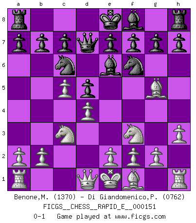 Last move : 0-1 2015 June 24 14:4:8 [Event "FICGS__CHESS__RAPID_E__000151"] [Site "FICGS"] [Date "2015.05.11"] [Round "1"] [White "Benone,Mateia"] [Black "Di Giandomenico,Pierino"] [Result "0-1"] [WhiteElo "1370"] [BlackElo "0762"] 1.Nf3 d5 2.d4 Nf6 3.c4 Be6 4.c5 Qd7 5.Nc3 Nc6 6.Bg5 Ng4 7.h3 Nf6 0-1 This chess game has been lost on time (started : 2015.05.11 2:40:38) Reti Opening Player Black won this chess game. Follow this game move after move (download)Chess, like love, like music, has the power to make people happy. (Siegbert Tarrasch) Wenn ich Weiß habe gewinne ich weil ich Weiß habe, wenn ich Schwarz habe gewinne ich weil ich Bogoljubov bin. (Efim Bogoljubov) Creo que una cierta cantidad de temperamento es esperada de los genios del Ajedrez. (Ron Gross) Les échecs, c'est l'imagination. (David Bronstein) If computers get too powerful, we can organize them into committees. That'll do them in. (Anonymous)