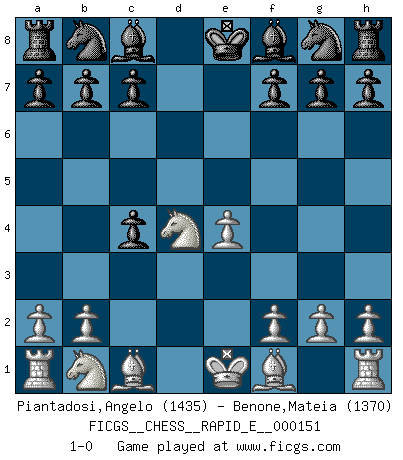 Last move : 1-0 2015 June 21 1:41:42 [Event "FICGS__CHESS__RAPID_E__000151"] [Site "FICGS"] [Date "2015.05.11"] [Round "1"] [White "Piantadosi,Angelo"] [Black "Benone,Mateia"] [Result "1-0"] [WhiteElo "1435"] [BlackElo "1370"] 1.d4 d5 2.c4 dxc4 3.e4 e5 4.Nf3 exd4 5.Qxd4 Qxd4 6.Nxd4 1-0 This chess game has been lost on time (started : 2015.05.11 2:40:38) QGA : 3.e4 Player White won this chess game. Follow this game move after move (download)No other master has such a terrific will to win. At the board he radiates danger, and even the strongest opponents tend to freeze, like rabbits when they smell a panther. Even his weaknesses are dangerous. As white, his opening game is predictable - you can make plans against it - but so strong that your plans almost never work. In the middle game his precision and invention are fabulous, and in the end game you simply cannot beat him. (Anonymous German Expert) Wir irren allesamt, nur jeder irrt anders. (Georg Christoph Lichtenberg) Después de la respuesta de las negras a 1.e4 con 1..e5, se quedan siempre tratando de entrar dentro del juego. (Howard Staunton) Le succès, c'est être capable d'aller d'échec en échec sans perdre son enthousiasme. (Winston Churchill) Art is not a thing, it is a way. (Elbert Hubbard)