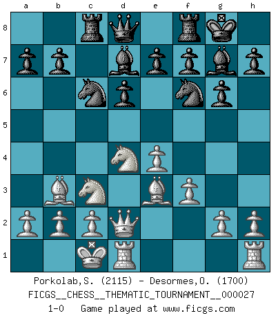 Last move : 1-0 2007 June 21 20:20:19 [Event "FICGS__CHESS__THEMATIC_TOURNAMENT__000027"] [Site "FICGS"] [Date "2007.03.03"] [Round "1"] [White "Porkolab,Sandor"] [Black "Desormes,Olivier"] [Result "1-0"] [WhiteElo "2115"] [BlackElo "1700"] 1.e4 c5 2.Nf3 d6 3.d4 cxd4 4.Nxd4 Nf6 5.Nc3 g6 6.Be3 Bg7 7.f3 O-O 8.Qd2 Nc6 9.O-O-O Bd7 10.Bc4 Rc8 11.Bb3 1-0 This chess game has been lost on time (started : 2007.03.03 20:53:57) Sicilian : Dragon, Yugoslav attack, 7...O-O Kingside Castling by player Black (move 7) Queenside Castling by player White (move 9) Player White won this chess game. Follow this game move after move (download)He who takes the Queen's Knight's Pawn will sleep in the streets. (Anonymous) Wenn Du absolut nicht mehr weißt, was Du tun sollst, dann ist es Zeit für Panik. (John van der Wiel) ¿Porque tengo que perder ante este idiota?. (Aron Nimzovich) Des combinaisons [dans le jeu d'échecs] pareilles à des mélodies. Je crois entendre pour ainsi dire la musique des coups... (Vladimir Nabokov) Once you start thinking you have nothing left to learn, you have everything to learn. (Steve Badget)