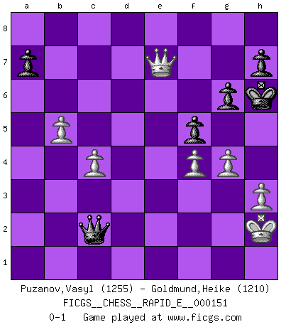Last move : 0-1 2015 September 11 2:19:19 [Event "FICGS__CHESS__RAPID_E__000151"] [Site "FICGS"] [Date "2015.05.11"] [Round "1"] [White "Puzanov,Vasyl"] [Black "Goldmund,Heike"] [Result "0-1"] [WhiteElo "1255"] [BlackElo "1210"] 1.e4 d5 2.exd5 Qxd5 3.Nc3 Qa5 4.d4 Nf6 5.Bd2 c6 6.Nf3 Bf5 7.a3 Qc7 8.h3 e6 9.Be2 Bd6 10.O-O Ne4 11.Nxe4 Bxe4 12.c4 Nd7 13.Bc3 O-O 14.Nd2 Bg6 15.b4 b6 16.Bf3 Rad8 17.Ne4 Bxe4 18.Bxe4 Nf6 19.Qc2 Nxe4 20.Qxe4 Rfe8 21.f4 c5 22.dxc5 bxc5 23.b5 f5 24.Qe3 Qf7 25.Be5 Be7 26.Rad1 Bf8 27.a4 g6 28.Rd2 Bg7 29.Rfd1 Rxd2 30.Rxd2 Bxe5 31.Qxe5 Qe7 32.Rd6 Rd8 33.Rxd8+ Qxd8 34.Qxe6+ Kg7 35.Qe5+ Kh6 36.Qxc5 Qd1+ 37.Kh2 Qxa4 38.Qf8+ Kh5 39.Qe7 Kh6 40.g4 Qc2+ 0-1 Scandinavian (centre counter) defense Kingside Castling by player White (move 10) Kingside Castling by player Black (move 13) Player Black won this chess game. Follow this game move after move (download)Chess is imagination. (David Bronstein) Ich möchte Schüler heranbilden, die das Vermögen haben, selbst zu denken und Kritik zu üben. (Emanuel Lasker) Las ideas audaces son como las piezas del Ajedrez que avanzan hacia adelante. Ellas pueden ser vencidas, pero también pueden iniciar una partida victoriosa. (Goethe) Aucun coup ne doit être joué sans but. (Pedro Damiano) Whenever people agree with me, I always feel I must be wrong. (Oscar Wilde)