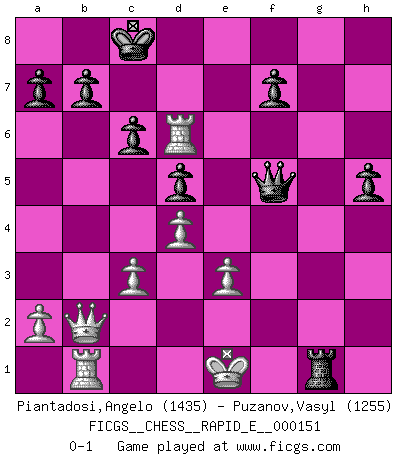 Last move : 0-1 2015 July 23 21:7:2 [Event "FICGS__CHESS__RAPID_E__000151"] [Site "FICGS"] [Date "2015.05.11"] [Round "1"] [White "Piantadosi,Angelo"] [Black "Puzanov,Vasyl"] [Result "0-1"] [WhiteElo "1435"] [BlackElo "1255"] 1.d4 d5 2.c4 e6 3.Nc3 Nf6 4.Bg5 Bb4 5.e3 Bxc3+ 6.bxc3 c6 7.cxd5 exd5 8.Nf3 Bg4 9.Be2 Nbd7 10.Ne5 Bxe2 11.Qxe2 h6 12.Bh4 g5 13.Bg3 Qe7 14.O-O O-O-O 15.Rab1 Ne4 16.Nxd7 Qxd7 17.Qb2 h5 18.h4 Rhg8 19.hxg5 Nxg3 20.fxg3 Rxg5 21.Rf6 Rxg3 22.Rd6 Rxg2+ 23.Kxg2 Rg8+ 24.Kf2 Qf5+ 25.Ke1 Rg1+ 0-1 QGD : 4.Bg5 Kingside Castling by player White (move 14) Queenside Castling by player Black (move 14) Player Black won this chess game. Follow this game move after move (download)Everything is in a state of flux, and this includes the world of Chess. (Mikhail Botvinnik) Ich brauche nur einen Blick auf das Schachbrett zu werfen, und weiß schon, was in der Stellung steckt, was geschehen kann und was geschehen wird. Alle übrigen suchen und prüfen, ich aber weiß es! (José Raúl Capablanca) El jugador de combinación piensa hacia adelante; comienza de la posición dada y trabaja las movidas contundentes en su mente. (Emanuel Lasker) Le jeu d'échecs est comme rejeté hors du temps. (Antoine de Saint-Exupéry) O divine art of subtlety and secrecy! Through you we learn to be invisible, through you inaudible and hence we can hold the enemy's fate in our hands. (Sun Tzu)
