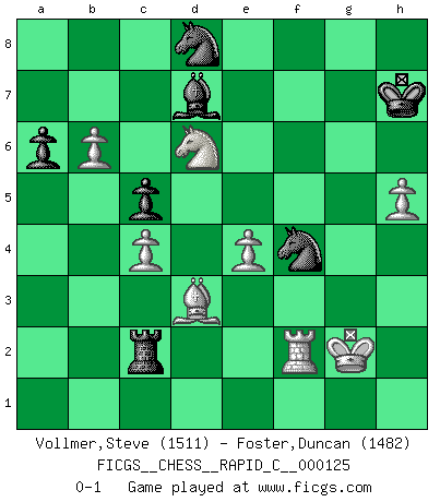 Last move : 0-1 2015 June 14 0:34:28 [Event "FICGS__CHESS__RAPID_C__000125"] [Site "FICGS"] [Date "2015.05.15"] [Round "1"] [White "Vollmer,Steve"] [Black "Foster,Duncan"] [Result "0-1"] [WhiteElo "1511"] [BlackElo "1482"] 1.e4 b6 2.d4 Bb7 3.Nc3 e6 4.Nf3 h6 5.Bd3 a6 6.O-O g6 7.Be3 d6 8.Qd2 Bg7 9.a4 Nd7 10.d5 e5 11.Ne2 Ne7 12.c4 c5 13.Ne1 Nf6 14.f3 g5 15.Bc2 Ng6 16.Nd3 O-O 17.b4 Nh5 18.bxc5 bxc5 19.Rab1 Bc8 20.a5 f5 21.Rb6 Ne7 22.Bxg5 hxg5 23.Qxg5 Nf6 24.h4 f4 25.h5 Nh7 26.Qh4 Bf6 27.Qh2 Kh8 28.g4 fxg3 29.Nxg3 Rg8 30.Kf2 Qd7 31.Rfb1 Qc7 32.f4 exf4 33.Nxf4 Be5 34.Qh4 Bxf4 35.Qxf4 Bg4 36.Qxd6 Qxd6 37.Rxd6 Rgf8+ 38.Kg1 Rf3 39.Kg2 Rc3 40.Bb3 Rb8 41.Rb6 Rxb6 42.axb6 Bc8 43.Bd1 Bb7 44.Be2 Ng5 45.d6 Nc6 46.d7 Nd8 47.Rf1 Kg7 48.Nf5+ Kh7 49.Nd6 Bc6 50.Rf8 Nge6 51.Rf3 Rc2 52.Rf2 Bxd7 53.Bd3 Nf4+ 0-1 Owen defense Kingside Castling by player White (move 6) Kingside Castling by player Black (move 16) Player Black won this chess game. Follow this game move after move (download)If your opponent cannot do anything active, then don't rush the position; instead you should let him sit there, suffer, and beg you for a draw. (Jeremy Silman) In Buenos Aires ist es nicht mein vorrangiges Ziel ein starkes Turnier zu organisieren, sondern ein Turnier für Gentlemen. Ich würde nie Kamsky einladen. Ich mag keine Probleme. (Miguel Najdorf) El Ajedrez es 99 por ciento táctica. (Teichmann) Toutes les manuvres exécutées sur une colonne ouverte ont pour but ultime l'intrusion définitive sur la septième ou la huitième rangée, en plein cur de la position ennemie. (Aaron Nimzovitch) Those who make the worst use of their time are the first to complain of its brevity. (Jean de la Bruyere)
