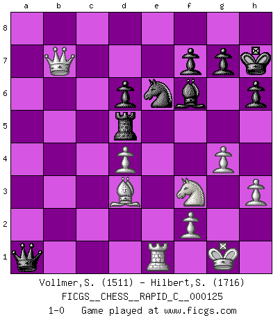 Last move : 1-0 2015 July 21 15:14:25 [Event "FICGS__CHESS__RAPID_C__000125"] [Site "FICGS"] [Date "2015.05.15"] [Round "1"] [White "Vollmer,Steve"] [Black "Hilbert,Stephan J."] [Result "1-0"] [WhiteElo "1511"] [BlackElo "1716"] 1.c4 c5 2.Nf3 Nf6 3.Nc3 Nc6 4.g3 e5 5.Bg2 d6 6.O-O Be7 7.d3 O-O 8.Bg5 Be6 9.Qd2 a6 10.a4 Rb8 11.h3 h6 12.Bxf6 Bxf6 13.e3 Na5 14.Rab1 Nb3 15.Qc2 Na5 16.b4 cxb4 17.Rxb4 Nc6 18.R4b1 Ne7 19.Ne4 Ng6 20.d4 exd4 21.exd4 Bf5 22.g4 Bxe4 23.Qxe4 Re8 24.Qc2 Nf4 25.Rfe1 Rxe1+ 26.Rxe1 b5 27.axb5 axb5 28.cxb5 Rxb5 29.Bf1 Rd5 30.Qc6 Kh7 31.Re4 Qa5 32.Qb7 Ne6 33.Bd3 Qa1+ 34.Re1 1-0 English : Symmetrical variation Kingside Castling by player White (move 6) Kingside Castling by player Black (move 7) Player White won this chess game. Follow this game move after move (download)When the Chess game is over, the Pawn and the King go back to the same box. (Irish saying) Garry Kasparov war erst in der Großmeister-Organisation GMA, dann in der Profischach-Vereinigung PCA, zum Schluss kehrte er wieder in den Schoß der FIDE zurück. Aber gut, manche Leute sind flexibel (Viswanathan Anand) El Ajedrez es un terrible juego. Si no controlas el centro, tu oponente tiene una posición mas holgada. Si tienes control del centro, ¡entonces realmente tu tienes algo de que preocuparte!. (Siegbert Tarrasch) Je ne suis pas le dernier à jouer lâchement des coups douteux pendant le zeïtnot de l'adversaire pour l'achever: en effet les coups qui font le plus peur sont ceux que l'on ne comprend pas. Je me fais souvent peur quand je joue. (Un professeur anonyme) I don't believe in psychology. I believe in good moves. (Bobby Fischer)