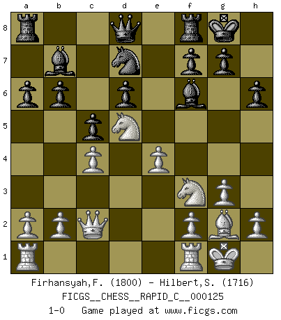 Last move : 1-0 2015 August 25 21:40:25 [Event "FICGS__CHESS__RAPID_C__000125"] [Site "FICGS"] [Date "2015.05.15"] [Round "1"] [White "Firhansyah,Firhan"] [Black "Hilbert,Stephan J."] [Result "1-0"] [WhiteElo "1800"] [BlackElo "1716"] 1.d4 Nf6 2.c4 e6 3.Nf3 b6 4.Bg5 Be7 5.Nc3 O-O 6.g3 Bb7 7.Bg2 h6 8.Bxf6 Bxf6 9.O-O a6 10.e3 d6 11.Qc2 Nd7 12.e4 c5 13.d5 exd5 14.Nxd5 1-0 This chess game has been lost on time (started : 2015.05.15 3:4:48) Queen's Indian defense Kingside Castling by player Black (move 5) Kingside Castling by player White (move 9) Player White won this chess game. Follow this game move after move (download)Only sissies Castle. (Rob Sillars) Über Kasparov: Es ist offensichtlich, daß er in einem totalitären Staat aufwuchs und deshalb zu diktatorischen Zügen neigt. (Viktor Kortschnoi) ¿Porque tengo que perder ante este idiota?. (Aron Nimzovich) C'est une question de caractère, Beaucoup de gens perdent leur motivation très vite. D'autres, ils sont rares, peuvent la conserver très longtemps. J'aime les échecs, encore aujourd'hui je suis heureux d'analyser des parties. J'aime toujours gagner, je déteste encore perdre. Bien jouer est important pour mon intégrité intellectuelle et morale. Et puis les échecs vivent en ce moment une période historique grâce à Internet. Ils se développent dans les systèmes éducatifs à travers le monde. Ils sortent de leur ghetto, et c'est mon rôle de mener à bien cette révolution. (Gary Kasparov) The large trees attract high winds. (Chinese proverb)