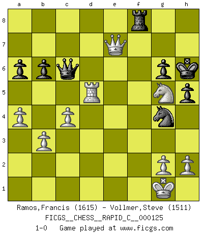 Last move : 1-0 2015 June 22 18:13:16 [Event "FICGS__CHESS__RAPID_C__000125"] [Site "FICGS"] [Date "2015.05.15"] [Round "1"] [White "Ramos,Francis"] [Black "Vollmer,Steve"] [Result "1-0"] [WhiteElo "1615"] [BlackElo "1511"] 1.e4 Nf6 2.Nc3 d6 3.Bc4 c5 4.Nf3 Nc6 5.d4 cxd4 6.Nxd4 g6 7.Be3 Bg7 8.Bb3 O-O 9.O-O a6 10.a4 Nxd4 11.Bxd4 b6 12.f4 Bb7 13.Qe2 Bc6 14.Rad1 Qc7 15.e5 dxe5 16.fxe5 Nd7 17.e6 fxe6 18.Bxe6+ Kh8 19.Ne4 Nf6 20.Ng5 Be8 21.Qe4 Bc6 22.Qh4 h6 23.Nf7+ Kh7 24.Be3 h5 25.Ng5+ Kh8 26.b3 Rad8 27.Bf7 Rxd1 28.Rxd1 Be4 29.Nxe4 Rxf7 30.Ng5 Rf8 31.c4 Qc6 32.Bd4 Kg8 33.Qe1 Ng4 34.Bxg7 Kxg7 35.Qxe7+ Kh6 36.Rd5 1-0 Alekhine's defense Kingside Castling by player Black (move 8) Kingside Castling by player White (move 9) Player White won this chess game. Follow this game move after move (download)I still hope to kill Fischer. (Boris Spassky) Schachspieler können ausgezeichnet Varianten am Schachbrett berechnen, aber nicht im realen Leben. Zu stark ist der Individualismus im Schach ausgeprägt, und für viele ist ein kleiner momentaner persönlicher Vorteil wichtiger als ein weit größerer Vorteil von morgen. (Anatoly Karpov) Antes de los Finales, los dioses han colocado el Juego Medio. (Siegbert Tarrasch) Fischer est le meilleur joueur du monde et Karpov n'est qu'un joueur de bistrot. (Garry Kasparov, agé de 16 ans) Train yourself to let go of everything you fear to lose. (Master Yoda in Star Wars ep.3)