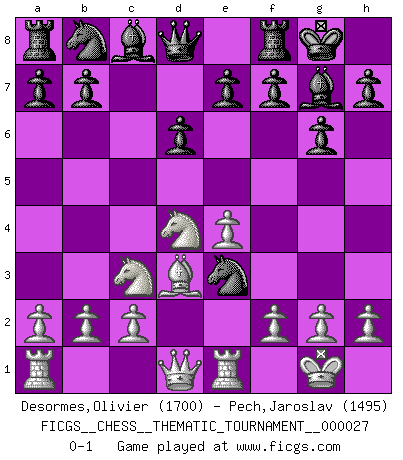 Last move : 0-1 2007 May 3 13:37:34 [Event "FICGS__CHESS__THEMATIC_TOURNAMENT__000027"] [Site "FICGS"] [Date "2007.03.03"] [Round "1"] [White "Desormes,Olivier"] [Black "Pech,Jaroslav"] [Result "0-1"] [WhiteElo "1700"] [BlackElo "1495"] 1.e4 c5 2.Nf3 d6 3.d4 cxd4 4.Nxd4 Nf6 5.Nc3 g6 6.Be3 Bg7 7.Bd3 O-O 8.O-O Ng4 9.Re1 Nxe3 0-1 This chess game has been lost on time (started : 2007.03.03 20:53:57) Sicilian : Dragon, 6.Be3 Kingside Castling by player Black (move 7) Kingside Castling by player White (move 8) Player Black won this chess game. Follow this game move after move (download)A good sacrifice is one that is not necessarily sound but leaves your opponent dazed and confused. (Rudolph Spielmann) Ich würde mich als ganz normalen Jungen bezeichnen [Im Alter von 12]. (Sergej Karjakin) El Ajedrez es una manera fabulosa para que los niños aprendan a autovalorarse y a autoestimarse. (Saudin Robovic) J'apprécie les joueurs d'est-indienne, c'est grâce à eux que je nourris ma famille depuis tant d'années. (Petrosian) Men never do evil so completely and cheerfully as when they do it from religious conviction. (Blaise Pascal)