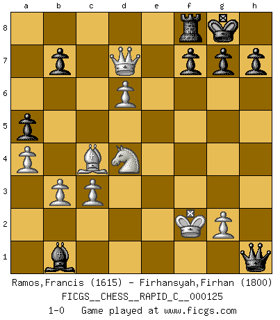 Last move : 1-0 2015 August 11 8:22:45 [Event "FICGS__CHESS__RAPID_C__000125"] [Site "FICGS"] [Date "2015.05.15"] [Round "1"] [White "Ramos,Francis"] [Black "Firhansyah,Firhan"] [Result "1-0"] [WhiteElo "1615"] [BlackElo "1800"] 1.e4 e5 2.Nf3 Nc6 3.Bb5 Nf6 4.O-O Be7 5.Re1 d6 6.c3 O-O 7.h3 a5 8.d4 Bd7 9.d5 Nb8 10.Bf1 c6 11.dxc6 Bxc6 12.Nbd2 Nbd7 13.Qc2 Qc7 14.a4 Nc5 15.b3 Rac8 16.Ba3 Ne6 17.Rad1 Bd7 18.Bc4 Nc5 19.Re3 Nh5 20.Nh2 Bg5 21.R3e1 Nf4 22.Ndf3 Be7 23.Bf1 Qb6 24.Rb1 Rc7 25.Bc4 d5 26.exd5 e4 27.Bxc5 Bxc5 28.Nd4 Qg6 29.Qxe4 Nxh3 30.Kf1 Nxf2 31.Kxf2 Bf5 32.Qf4 Bxb1 33.Qxc7 Bd6 34.Qd7 Bg3 35.Kf1 Bxe1 36.Kxe1 Qg3 37.Kf1 Qxh2 38.d6 Qh1 39.Kf2 1-0 This chess game has been lost on time (started : 2015.05.15 3:4:48) Ruy Lopez : Berlin defense, 4.O-O Kingside Castling by player White (move 4) Kingside Castling by player Black (move 6) Player White won this chess game. Follow this game move after move (download)All I want to do, ever, is just play Chess. (Bobby Fischer) Capablanka war das größte Genie der Schachgeschichte! Aber denken sie nicht er habe nichts vom Schach verstanden. Er wusste nur soviel wie er wissen musste um seine Ziele zu erreichen. (Mikhail Moiseyevich Botvinik) Yo he agregado estos principios a la ley: pongan los Caballos en acción antes de que los dos Alfiles sean desarrollados. (Emanuel Lasker) Roi des jeux et jeu des rois, les échecs portent en eux un sentiment d'infini. Ils donnent à celui qui s'est efforcé d'en approfondir les arcanes l'impression de n'être pas à la mesure de l'homme; en fait, ils constituent un résumé de l'univers, un microcosme, et figurent cette grande échelle qui, dans les plans de la lumière descend jusqu'à la matière, qui des abîmes insondables remonte jusqu'en l'infini de Dieu. (Pyrame) You must have a dream in order to have it come true. (A.P.J. Kalam)