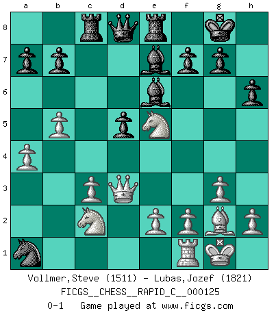Last move : 0-1 2015 June 7 2:1:31 [Event "FICGS__CHESS__RAPID_C__000125"] [Site "FICGS"] [Date "2015.05.15"] [Round "1"] [White "Vollmer,Steve"] [Black "Lubas,Jozef"] [Result "0-1"] [WhiteElo "1511"] [BlackElo "1821"] 1.Nf3 Nf6 2.d4 e6 3.g3 c5 4.Bg2 cxd4 5.Nxd4 d5 6.O-O e5 7.Nf3 Nc6 8.Bg5 Be7 9.c3 Be6 10.a4 h6 11.Bd2 O-O 12.Na3 Re8 13.Nc2 Rc8 14.b4 Ne4 15.b5 Na5 16.Nxe5 Nxd2 17.Qxd2 Nb3 18.Qd3 Nxa1 0-1 Reti Opening Kingside Castling by player White (move 6) Kingside Castling by player Black (move 11) Player Black won this chess game. Follow this game move after move (download)The passed Pawn is a criminal, who should be kept under lock and key. Mild measures, such as police surveillance, are not sufficient. (Aaron Nimzovich) Kleine Schachspieler machen Mist, und große Schachspieler machen Mist, aber große machen weniger Mist. (Fritz Sämisch) Preferería tener un Peón que un dedo. (Reuben Fine) Vous n'êtes pas toujours obligé de jouer le meilleur coup. Un coup doit être actif, entreprenant, correct et beau ! (David Bronstein) Strategy without tactics is the slowest route to victory. Tactics without strategy is the noise before defeat. (Sun Tzu)