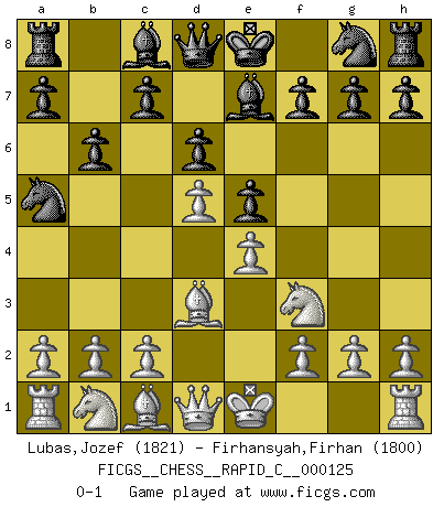 Last move : 0-1 2015 July 5 15:21:28 [Event "FICGS__CHESS__RAPID_C__000125"] [Site "FICGS"] [Date "2015.05.15"] [Round "1"] [White "Lubas,Jozef"] [Black "Firhansyah,Firhan"] [Result "0-1"] [WhiteElo "1821"] [BlackElo "1800"] 1.e4 e5 2.Nf3 Nc6 3.Bc4 Be7 4.d4 d6 5.d5 Na5 6.Bd3 b6 0-1 This chess game has been lost on time (started : 2015.05.15 3:4:48) Hungarian defense Player Black won this chess game. Follow this game move after move (download)Life is like a game of Chess, changing with each move. (Chinese proverb) Ein Springer auf f6 gegen die eigene Rochadestellung ist schlimmer als ein rostiger Nagel im Knie. (Efim Bogoljubov) En el tablero, la mentira e hipocresía no sobreviven mucho. (Emanuel Lasker) Il s'avisa de me proposer d'apprendre les échecs qu'il jouait un peu... me voilà forcené des échecs. J'achète un échiquier, je m'enferme dans ma chambre, j'y passe des jours et des nuits à vouloir apprendre par cur toutes les parties. (Jean-Jacques Rousseau, Confessions) May I never be complete. May I never be content. May I never be perfect. Deliver me, Tyler, from being perfect and complete. (Chuck Palahniuk, Fight Club)