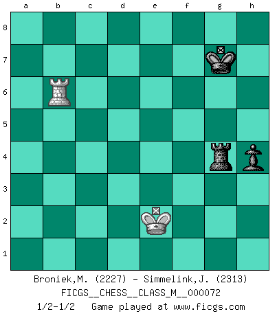 Last move : 1/2-1/2 2016 June 15 17:44:53 [Event "FICGS__CHESS__CLASS_M__000072"] [Site "FICGS"] [Date "2015.05.18"] [Round "1"] [White "Broniek,Mariusz Maciej"] [Black "Simmelink,Joop"] [Result "1/2-1/2"] [WhiteElo "2227"] [BlackElo "2313"] 1.e4 c5 2.Nf3 d6 3.d4 cxd4 4.Nxd4 Nf6 5.Nc3 g6 6.Be3 Bg7 7.f3 Nc6 8.Qd2 O-O 9.Bc4 Bd7 10.Bb3 Nxd4 11.Bxd4 b5 12.h4 a5 13.h5 a4 14.Bd5 b4 15.Bxf6 exf6 16.Ne2 f5 17.Bxa8 Qxa8 18.Qxd6 Be6 19.exf5 Bxf5 20.h6 Rd8 21.Qf4 a3 22.hxg7 axb2 23.Rb1 b3 24.axb3 Bxc2 25.Kf2 Bxb1 26.Rxb1 Qa2 27.Qe4 Qxb3 28.Qe7 Rc8 29.Qd6 Qa2 30.Qd3 Rb8 31.Kg3 Qe6 32.Nc3 Qe5+ 33.Kf2 Qg5 34.Qe3 Qh4+ 35.Kg1 Qc4 36.Qd2 Qc5+ 37.Kf1 Qc4+ 38.Kf2 Qh4+ 39.Kg1 Qb4 40.Ne4 Qxd2 41.Nxd2 f5 42.Kf2 Kxg7 43.Ke3 Kf6 44.Nc4 Re8+ 45.Kf2 Rc8 46.Ne3 Rb8 47.Nd1 Rd8 48.Ke2 Re8+ 49.Kd2 Rd8+ 50.Ke1 Re8+ 51.Kf1 Rd8 52.Ne3 Rb8 53.g3 g5 54.Nd1 g4 55.f4 Rb3 56.Kf2 Rf3+ 57.Ke2 Rxg3 58.Rxb2 Rg2+ 59.Kd3 Rg3+ 60.Ne3 Rf3 61.Ke2 h5 62.Rb5 Kg6 63.Rb4 h4 64.Rb6+ Kf7 65.Nxf5 Rxf4 66.Nh6+ Kg7 67.Nxg4 Rxg4 1/2-1/2 Sicilian : Dragon, Yugoslav attack Kingside Castling by player Black (move 8) 10 pieces endgame at move 57 : White KRNP , Black KRPPPP WHITE : King + 1 Rook 1 Knight 1 Pawn BLACK : King + 1 Rook 4 Pawns 9 pieces endgame at move 58 : White KRNP , Black KRPPP WHITE : King + 1 Rook 1 Knight 1 Pawn BLACK : King + 1 Rook 3 Pawns 8 pieces endgame at move 65 : White KRNP , Black KRPP WHITE : King + 1 Rook 1 Knight 1 Pawn BLACK : King + 1 Rook 2 Pawns 7 pieces endgame at move 65 : White KRN , Black KRPP WHITE : King + 1 Rook 1 Knight BLACK : King + 1 Rook 2 Pawns 6 pieces endgame at move 67 : White KRN , Black KRP WHITE : King + 1 Rook 1 Knight BLACK : King + 1 Rook 1 Pawn 5 pieces endgame at move 67 : White KR , Black KRP WHITE : King + 1 Rook BLACK : King + 1 Rook 1 Pawn This chess game ended in a draw. Follow this game move after move (download)Bobby Fischer's current state of mind is indeed a tragedy. One of the world's greatest Chess players - the pride and sorrow of American Chess. (Frank Brady) Fischer machte Schach einfach zu einer aufregenden Sache, wann immer er sich ans Brett setzte. (Raymond Keene) Uno no tiene que jugar muy bien, es suficiente jugar mejor que el oponente. (Siegbert Tarrasch) Les Echecs sont affaire de jugement sensible. Savoir quand frapper et quand esquiver. (Fischer) Tree pose grows confidence. It roots me to this world. (Terri Guillemets)
