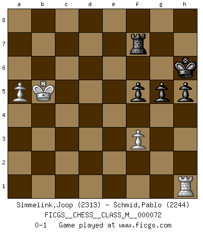 Last move : 0-1 2016 June 26 11:15:57 [Event "FICGS__CHESS__CLASS_M__000072"] [Site "FICGS"] [Date "2015.05.18"] [Round "1"] [White "Simmelink,Joop"] [Black "Schmid,Pablo"] [Result "0-1"] [WhiteElo "2313"] [BlackElo "2244"] 1.e4 c5 2.Nf3 d6 3.d4 cxd4 4.Nxd4 Nf6 5.Nc3 g6 6.Be3 Bg7 7.f3 O-O 8.Qd2 Nc6 9.O-O-O d5 10.Kb1 Nxd4 11.e5 Nf5 12.exf6 exf6 13.Nxd5 Nxe3 14.Qxe3 Be6 15.Bc4 f5 16.Qa3 Qh4 17.Bb3 Qf2 18.h4 h5 19.Qa5 b6 20.Qe1 Qc5 21.Qg1 Rfb8 22.Qxc5 bxc5 23.Nc7 c4 24.Nxe6 fxe6 25.Bxc4 Rxb2+ 26.Kc1 Rb6 27.Kd2 a5 28.a4 Be5 29.Ke2 Rb4 30.Bxe6+ Kg7 31.Bb3 Bg3 32.Rd5 Bxh4 33.Kd3 Bg3 34.Rb5 Rd8+ 35.Kc3 Rbd4 36.Rxa5 Rd2 37.Rb5 Rxg2 38.a5 Rf2 39.Bd5 Rc8+ 40.Kb4 Bd6+ 41.Ka4 R8xc2 42.Rb6 Bc5 43.Rc6 Rfd2 44.Rc7+ Kh6 45.Bf7 Rc3 46.Kb5 Rb2+ 47.Ka6 Rd3 48.Rxc5 Rd6+ 49.Ka7 Rd7+ 50.Ka6 Rxf7 51.Rb5 Rxb5 52.Kxb5 g5 0-1 Sicilian : Dragon, Yugoslav attack, 7...O-O Kingside Castling by player Black (move 7) Queenside Castling by player White (move 9) 10 pieces endgame at move 51 : White KRPP , Black KRRPPP WHITE : King + 1 Rook 2 Pawns BLACK : King + 2 Rooks 3 Pawns 9 pieces endgame at move 52 : White KRPP , Black KRPPP WHITE : King + 1 Rook 2 Pawns BLACK : King + 1 Rook 3 Pawns Player Black won this chess game. Follow this game move after move (download)It is no time to be playing Chess when the house is on fire. (Italian Proverb) Die Partien sind immer verschieden, die Interviews immer die gleichen. (Garry Kasparov) Aún el Rey más flojo huye despavorido ante la amenaza de un Jaque doble. (Aaron Nimzowitsch) Les Echecs représentent une sphère d'idées créatrices basée sur la volonté des deux protagonistes. (Smyslov) Nobody is always a winner, and anybody who says he is, is either a liar or doesn't play poker. (Amarillo Slim)