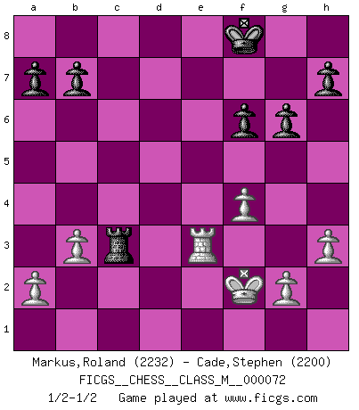 Last move : 1/2-1/2 2015 July 2 11:2:11 [Event "FICGS__CHESS__CLASS_M__000072"] [Site "FICGS"] [Date "2015.05.18"] [Round "1"] [White "Markus,Roland"] [Black "Cade,Stephen"] [Result "1/2-1/2"] [WhiteElo "2232"] [BlackElo "2200"] 1.e4 c5 2.c3 Nf6 3.e5 Nd5 4.d4 cxd4 5.Nf3 Nc6 6.cxd4 d6 7.Bc4 dxe5 8.dxe5 Ndb4 9.Qxd8+ Nxd8 10.Na3 Be6 11.O-O g6 12.Nd4 Bxc4 13.Nxc4 Rc8 14.b3 Bg7 15.f4 f6 16.Ba3 Nbc6 17.Bb2 fxe5 18.Nxc6 Nxc6 19.Rae1 O-O 20.Nxe5 Nxe5 21.Bxe5 Bf6 22.h3 Rc2 23.Bxf6 exf6 24.Rf2 Rfc8 25.Re7 R2c7 26.Rfe2 Kf8 27.Rxc7 Rxc7 28.Kf2 Rc3 29.Re3 1/2-1/2 Sicilian : Alapin's variation (2.c3) Kingside Castling by player White (move 11) Kingside Castling by player Black (move 19) This chess game ended in a draw. Follow this game move after move (download)I play correspondence chess because it is both art and science while chess is art only. (A player at FICGS) Ich brauche nur einen Blick auf das Schachbrett zu werfen, und weiß schon, was in der Stellung steckt, was geschehen kann und was geschehen wird. Alle übrigen suchen und prüfen, ich aber weiß es! (José Raúl Capablanca) Mis oponentes también hacen buenas movidas. A veces yo no tomo esas cosas en consideración. (Bobby Fischer) Un millionnaire : 'Monsieur Steinitz ! Vous ne participez aux tournois que pour l'argent, alors que moi je n'y viens que pour l'honneur.' Steinitz : 'Chacun joue pour ce qu'il n'a pas'... The beginning is the most important part of the work. (Plato)