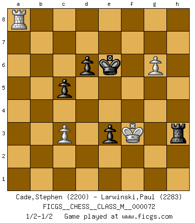 Last move : 1/2-1/2 2015 July 25 20:5:21 [Event "FICGS__CHESS__CLASS_M__000072"] [Site "FICGS"] [Date "2015.05.18"] [Round "1"] [White "Cade,Stephen"] [Black "Larwinski,Paul"] [Result "1/2-1/2"] [WhiteElo "2200"] [BlackElo "2283"] 1.d4 Nf6 2.c4 e6 3.Nc3 Bb4 4.e3 b6 5.Nge2 Ne4 6.f3 Nxc3 7.bxc3 Be7 8.e4 Nc6 9.Ng3 h5 10.Bd3 h4 11.Nf1 e5 12.d5 Na5 13.Ne3 Bg5 14.O-O Nb7 15.Bc2 d6 16.Ba4+ Bd7 17.Bxd7+ Qxd7 18.h3 Nc5 19.Qe2 Qd8 20.Nc2 Bxc1 21.Raxc1 Qg5 22.Nb4 O-O 23.Nd3 Nd7 24.Rce1 Rae8 25.f4 exf4 26.Rxf4 Ne5 27.Rf5 Qg3 28.Nxe5 Rxe5 29.Rf3 Qg5 30.Qf2 Qe7 31.Rf4 g5 32.Rf5 f6 33.Rxe5 Qxe5 34.Qf5 Kg7 35.Qxe5 fxe5 36.Rf1 Rc8 37.Kf2 c6 38.c5 bxc5 39.dxc6 Rxc6 40.Kf3 Ra6 41.Rd1 Kf7 42.Kg4 Ke6 43.Kxg5 Rxa2 44.Rg1 Re2 45.Kxh4 Rxe4+ 46.g4 Rf4 47.Kh5 e4 48.g5 Kf7 49.Ra1 e3 50.Rxa7+ Ke6 51.g6 Rf3 52.Ra8 Rxh3+ 53.Kg4 Rh1 54.Kf3 Rh3+ 1/2-1/2 Nimzo-Indian : Fischer variation Kingside Castling by player White (move 14) Kingside Castling by player Black (move 22) 10 pieces endgame at move 50 : White KRPPP , Black KRPPP WHITE : King + 1 Rook 3 Pawns BLACK : King + 1 Rook 3 Pawns 9 pieces endgame at move 52 : White KRPP , Black KRPPP WHITE : King + 1 Rook 2 Pawns BLACK : King + 1 Rook 3 Pawns This chess game ended in a draw. Follow this game move after move (download)If you aren't afraid of Spassky, then I have removed the element of money. (Jim Slater) Im Schach nämlich geht es darum, daß Ich des Gegners klein zu kriegen, sein Ego zu zerbrechen und zu zermahlen, seine Selbstachtung zu zertreten und zu verscharren und seine ganze mißachtenswerte sogenannte Persönlichkeit ein für alle Mal tot zu hacken und zu zerstampfen und dadurch die menschliche Gesellschaft von einer stinkenden Pestbeule zu befreien. Es ist ein königliches Spiel. (Robert James Fischer) La pasion por jugar al Ajedrez es una de las mas inexplicables en el mundo. (H.G. Wells) Je fais ceci parce que dans cinquante coups j'obtiendrai cela; je m'appelle Mikhail Moisevitch Botvinnik. (Botvinnik) Plans are ideas that never come to fruition. (Daniel Parmet)