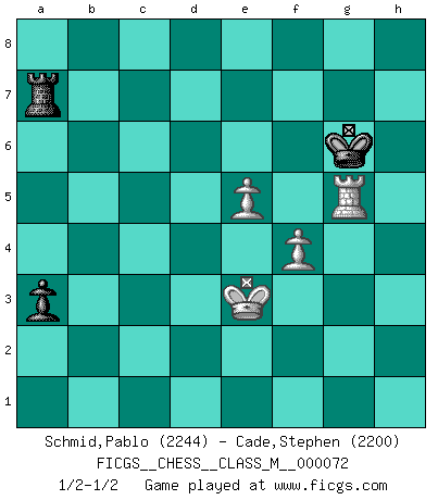 Last move : 1/2-1/2 2016 March 28 15:35:53 [Event "FICGS__CHESS__CLASS_M__000072"] [Site "FICGS"] [Date "2015.05.18"] [Round "1"] [White "Schmid,Pablo"] [Black "Cade,Stephen"] [Result "1/2-1/2"] [WhiteElo "2244"] [BlackElo "2200"] 1.d4 Nf6 2.c4 g6 3.Nc3 Bg7 4.e4 d6 5.Nf3 O-O 6.Be2 e5 7.O-O Nc6 8.d5 Ne7 9.Be3 Ng4 10.Bd2 f5 11.Ng5 Nf6 12.f3 Nh5 13.c5 dxc5 14.Qb3 Kh8 15.Rad1 b6 16.Bc1 f4 17.d6 cxd6 18.Nf7+ Rxf7 19.Qxf7 Nf6 20.Nb5 Ne8 21.b3 Ba6 22.a4 Bxb5 23.Bxb5 Nc7 24.Bb2 a6 25.Bc4 d5 26.a5 b5 27.Bxd5 Nexd5 28.Rxd5 Nxd5 29.Rd1 Rc8 30.Rxd5 Qxa5 31.Kf1 Qa2 32.Rd2 Qb1+ 33.Kf2 c4 34.Qe7 Rg8 35.Bxe5 h6 36.Qd6 Qc1 37.bxc4 Qxc4 38.Bxf4 Rf8 39.Be5 Rf7 40.Bxg7+ Kxg7 41.Qe5+ Kh7 42.Rd8 Rg7 43.Rb8 Qc2+ 44.Kg3 Qc6 45.h4 h5 46.Kh2 Qc7 47.Qxc7 Rxc7 48.Rb6 Ra7 49.Kg3 a5 50.Rxb5 a4 51.Rb2 a3 52.Ra2 Kg7 53.Kf4 Kf6 54.Ke3 g5 55.hxg5+ Kxg5 56.g3 Kf6 57.f4 Rg7 58.Kf3 Ra7 59.g4 hxg4+ 60.Kxg4 Rg7+ 61.Kf3 Ra7 62.Ke3 Ke6 63.Rh2 Kf6 64.e5+ Kf5 65.Rh5+ Kg6 66.Rg5+ Kf7 67.Rh5 Kg6 68.Rg5+ 1/2-1/2 King's Indian : Orthodox, Aronin-Taimanov variation (Yugoslav attack / Mar del Plata variation) Kingside Castling by player Black (move 5) Kingside Castling by player White (move 7) 10 pieces endgame at move 55 : White KRPPPP , Black KRPP WHITE : King + 1 Rook 4 Pawns BLACK : King + 1 Rook 2 Pawns 9 pieces endgame at move 55 : White KRPPP , Black KRPP WHITE : King + 1 Rook 3 Pawns BLACK : King + 1 Rook 2 Pawns 8 pieces endgame at move 59 : White KRPP , Black KRPP WHITE : King + 1 Rook 2 Pawns BLACK : King + 1 Rook 2 Pawns 7 pieces endgame at move 60 : White KRPP , Black KRP WHITE : King + 1 Rook 2 Pawns BLACK : King + 1 Rook 1 Pawn This chess game ended in a draw. Follow this game move after move (download)After black's reply to 1.e4 with 1..e5, leaves him always trying to get into the game. (Howard Staunton) Kann Schach nicht schließlich das Nationalspiel der Deutschen werden? Und welche weiteren Ausblicke bieten sich dann dar! Welche Hebung des allgemeinen Kultur-Niveaus, ja der Moral, wenn das Schachbrett den Kartentisch verdrängen würde! Wahrlich, ein Ziel, des Schweißes der Edlen wert! (Siegbert Tarrasch) El Ajedrez era la lengua materna de Capablanca. (Reti) A chaque perte on perd un peu de soi. (Joël Lautier) After growing wildly for years, the field of computing appears to be reaching its infancy. (John Pierce)