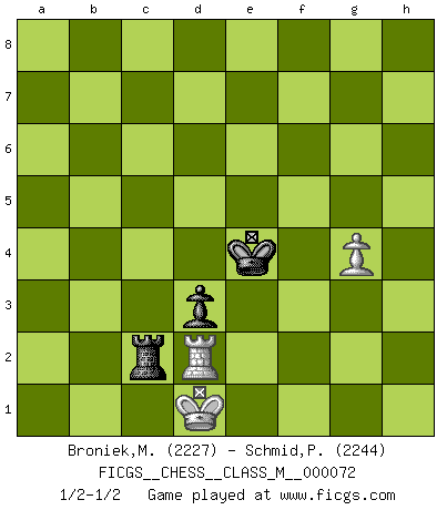 Last move : 1/2-1/2 2017 March 6 12:13:4 [Event "FICGS__CHESS__CLASS_M__000072"] [Site "FICGS"] [Date "2015.05.18"] [Round "1"] [White "Broniek,Mariusz Maciej"] [Black "Schmid,Pablo"] [Result "1/2-1/2"] [WhiteElo "2227"] [BlackElo "2244"] 1.e4 e6 2.d4 d5 3.Nc3 Nf6 4.e5 Nfd7 5.f4 c5 6.Nf3 Nc6 7.Be3 a6 8.Qd2 Qb6 9.O-O-O Qc7 10.Kb1 b5 11.f5 c4 12.fxe6 fxe6 13.Be2 Nb6 14.Rdf1 b4 15.Nd1 Na4 16.Ng5 Rb8 17.Bh5+ g6 18.Bg4 Qa5 19.Qf2 Nc3+ 20.Kc1 Rb7 21.Bxe6 Nxa2+ 22.Kd2 c3+ 23.bxc3 Bxe6 24.Qf6 bxc3+ 25.Ke2 Qa4 26.Qxe6+ Be7 27.Qc8+ Nd8 28.Kf2 Qc6 29.Qxc6+ Nxc6 30.Kg3 a5 31.Rf2 a4 32.Nf7 Rf8 33.e6 a3 34.Rhf1 g5 35.h4 Nd8 36.Nxd8 Rxf2 37.Rxf2 Bxd8 38.Bxg5 Bxg5 39.hxg5 Rb1 40.Rf7 Rxd1 41.Rxh7 Re1 42.Ra7 Rxe6 43.Rxa3 Nc1 44.Ra8+ Kf7 45.Rc8 Ne2+ 46.Kf2 Kg6 47.Rg8+ Kh5 48.g6 Nxd4 49.g7 Kg6 50.Rc8 Kxg7 51.Rxc3 Re2+ 52.Kf1 Rxc2 53.Rd3 Rc5 54.Rxd4 Kf6 55.Ke1 Ke5 56.Rd3 Ke4 57.Ke2 d4 58.g4 Rc2+ 59.Rd2 d3+ 60.Kd1 1/2-1/2 French : Steinitz, Boleslavsky variation Queenside Castling by player White (move 9) 10 pieces endgame at move 48 : White KRPPP , Black KRNPP WHITE : King + 1 Rook 3 Pawns BLACK : King + 1 Rook 1 Knight 2 Pawns 9 pieces endgame at move 50 : White KRPP , Black KRNPP WHITE : King + 1 Rook 2 Pawns BLACK : King + 1 Rook 1 Knight 2 Pawns 8 pieces endgame at move 51 : White KRPP , Black KRNP WHITE : King + 1 Rook 2 Pawns BLACK : King + 1 Rook 1 Knight 1 Pawn 7 pieces endgame at move 52 : White KRP , Black KRNP WHITE : King + 1 Rook 1 Pawn BLACK : King + 1 Rook 1 Knight 1 Pawn 6 pieces endgame at move 54 : White KRP , Black KRP WHITE : King + 1 Rook 1 Pawn BLACK : King + 1 Rook 1 Pawn This chess game ended in a draw. Follow this game move after move (download)Chess opens and enriches your mind. (Saudin Robovic) Der Verteidiger gebe der Gewalt nach, aber nur der Gewalt. Er schaffe sich nicht freiwillig, etwa aus Blindheit oder aus Schrecken, irgendwelche Schwächen. Er lasse sich nicht bluffen. (Emanuel Lasker) Solo existe una cosa que Fischer hace en el Ajedrez sin placer: ¡perder!. (Boris Spassky) C'est une question de caractère, Beaucoup de gens perdent leur motivation très vite. D'autres, ils sont rares, peuvent la conserver très longtemps. J'aime les échecs, encore aujourd'hui je suis heureux d'analyser des parties. J'aime toujours gagner, je déteste encore perdre. Bien jouer est important pour mon intégrité intellectuelle et morale. Et puis les échecs vivent en ce moment une période historique grâce à Internet. Ils se développent dans les systèmes éducatifs à travers le monde. Ils sortent de leur ghetto, et c'est mon rôle de mener à bien cette révolution. (Gary Kasparov) It's unlucky to be superstitious. (Dave Enteles)