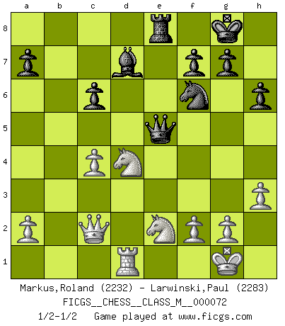 Last move : 1/2-1/2 2015 July 7 22:9:51 [Event "FICGS__CHESS__CLASS_M__000072"] [Site "FICGS"] [Date "2015.05.18"] [Round "1"] [White "Markus,Roland"] [Black "Larwinski,Paul"] [Result "1/2-1/2"] [WhiteElo "2232"] [BlackElo "2283"] 1.e4 e5 2.Ne2 Bc5 3.Nbc3 Nf6 4.d4 exd4 5.Nxd4 O-O 6.Bc4 d5 7.Nxd5 Nxe4 8.Be3 Nd7 9.O-O c6 10.Nf4 Ne5 11.Be2 Re8 12.c3 Bb6 13.Qc2 Ng4 14.Bxg4 Bxg4 15.h3 Bd7 16.Rfe1 Nf6 17.c4 Ba5 18.Re2 Bc7 19.Rd1 Qe7 20.Nd3 Qd6 21.Nf4 Qf8 22.Nd3 h6 23.Bf4 Bxf4 24.Nxf4 Qc5 25.Rxe8+ Rxe8 26.Nfe2 b5 27.b3 bxc4 28.bxc4 Qe5 1/2-1/2 Alapin's Opening Kingside Castling by player Black (move 5) Kingside Castling by player White (move 9) This chess game ended in a draw. Follow this game move after move (download)The combination player thinks forward; he starts from the given position, and tries the forceful moves in his mind. (Emanuel Lasker) Verschiedene, sehr schätzbare und im Laufe des Lebens nützliche Eigenschaften des Geistes können durch das Schachspiel erworben und gekräftigt werden, so dass sie zu Gewohnheiten werden, die uns nie im Stich lassen. (Benjamin Franklin) Cuando le juegas a Fischer, no es una cuestion de si vas a ganar o perder. Es una cuestion de si vas a sobrevivir. (Boris Spassky) L'attaque fait le spectacle, la défense gagne les matchs. (Dicton footballistique) Before all elsed, be armed. (Niccolo Machiavelli)