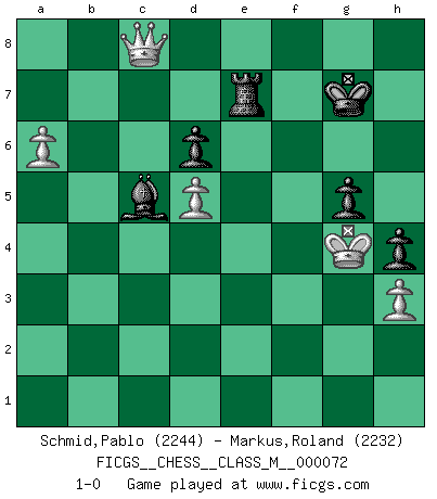 Last move : 1-0 2016 March 1 21:28:4 [Event "FICGS__CHESS__CLASS_M__000072"] [Site "FICGS"] [Date "2015.05.18"] [Round "1"] [White "Schmid,Pablo"] [Black "Markus,Roland"] [Result "1-0"] [WhiteElo "2244"] [BlackElo "2232"] 1.e4 c5 2.Nc3 d6 3.Nge2 Nf6 4.d4 cxd4 5.Nxd4 a6 6.Be3 e5 7.Nb3 Be6 8.Be2 Be7 9.O-O Nbd7 10.Qd3 O-O 11.a4 Rc8 12.a5 Qc7 13.Rfd1 Rfe8 14.Bf3 Qc4 15.Qd2 Ng4 16.Bg5 Ngf6 17.Qe1 h6 18.Be3 Nh7 19.g3 Nhf6 20.Bg2 Ng4 21.Bc1 Qc7 22.h3 Ngf6 23.Be3 h5 24.Nd2 h4 25.g4 Nf8 26.Nf3 Ng6 27.Qd2 Nd7 28.Ne1 Nc5 29.Nd5 Bxd5 30.exd5 Nd7 31.c3 Qd8 32.Ra3 Nc5 33.b4 Nd7 34.Bf1 Nf6 35.c4 Ne4 36.Qc2 Ng5 37.Bb6 Qd7 38.Nf3 e4 39.Nxg5 Bxg5 40.c5 f5 41.c6 Qf7 42.gxf5 Nf4 43.Rc3 Qxf5 44.cxb7 Rb8 45.b5 Rxb7 46.bxa6 Rbe7 47.a7 Bf6 48.Re3 Rc8 49.Qb1 Rf8 50.Kh1 Nh5 51.Bg2 Qxf2 52.Rxe4 Ng3+ 53.Kh2 Nxe4 54.Bxf2 Nxf2 55.Re1 Rxa7 56.Qb6 Rd7 57.Re3 Bg5 58.Rf3 Bf4+ 59.Kg1 Ne4 60.a6 Ng3 61.Bf1 Nxf1 62.Kxf1 R8f7 63.Qb8+ Kh7 64.Kg2 g5 65.Rb3 Kg7 66.Qc8 Rde7 67.Rb7 Be3 68.Rxe7 Rxe7 69.Kf3 Bc5 70.Kg4 1-0 Sicilian : Closed Kingside Castling by player White (move 9) Kingside Castling by player Black (move 10) Player White won this chess game. Follow this game move after move (download)The essence of Chess is thinking about what Chess is. (David Bronstein) Obendrein hat der FIDE-Präsident den Revolutionsführer Gaddafi zum »Großmeister« ernannt, am Ende der WM. Das ist lächerlich! (Joel Lautier) El Jaque al descubierto es el bombardero del tablero. (Reuben Fine) Roi des jeux et jeu des rois, les échecs portent en eux un sentiment d'infini. Ils donnent à celui qui s'est efforcé d'en approfondir les arcanes l'impression de n'être pas à la mesure de l'homme; en fait, ils constituent un résumé de l'univers, un microcosme, et figurent cette grande échelle qui, dans les plans de la lumière descend jusqu'à la matière, qui des abîmes insondables remonte jusqu'en l'infini de Dieu. (Pyrame) If you work for a living, why do you kill yourself working ? (Tuco to a chicken in The Good, The Bad and The Ugly)