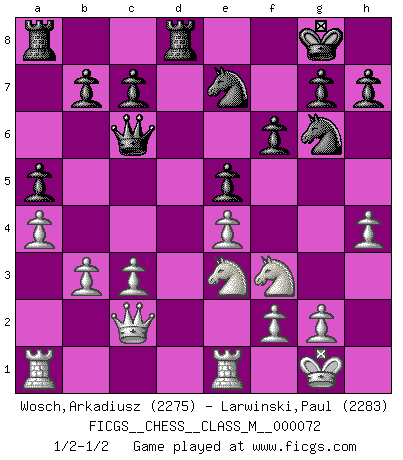Last move : 1/2-1/2 2015 August 26 17:59:47 [Event "FICGS__CHESS__CLASS_M__000072"] [Site "FICGS"] [Date "2015.05.18"] [Round "1"] [White "Wosch,Arkadiusz"] [Black "Larwinski,Paul"] [Result "1/2-1/2"] [WhiteElo "2275"] [BlackElo "2283"] 1.e4 e5 2.Nf3 Nc6 3.Bc4 Bc5 4.c3 Nf6 5.d3 a6 6.Bb3 d6 7.O-O O-O 8.Nbd2 Be6 9.h3 Qd7 10.Bxe6 Qxe6 11.Re1 a5 12.Nf1 d5 13.Bg5 dxe4 14.dxe4 Nd7 15.Be3 Rfd8 16.b3 Ne7 17.Qc2 f6 18.a3 Bxe3 19.Nxe3 Nf8 20.a4 Nfg6 21.h4 Qc6 1/2-1/2 Giuoco Piano Kingside Castling by player White (move 7) Kingside Castling by player Black (move 7) This chess game ended in a draw. Follow this game move after move (download)The most powerful weapon in Chess is to have the next move. (David Bronstein) Nach Morphy wurde nichts neues mehr in der Behandlung offener Positionen gefunden. (Mikhail Moiseyevich Botvinik) No hay precio que sea tan grande por la cabellera del Rey enemigo. (Koblentz) Le moment que je préfère le plus dans une rencontre, c'est celui où je sens que la personnalité de l'adversaire se brise. (Robert Fischer) I fear not the man who has practiced 10,000 kicks once, but I fear the man who has practiced one kick 10,000 times. (Bruce Lee)