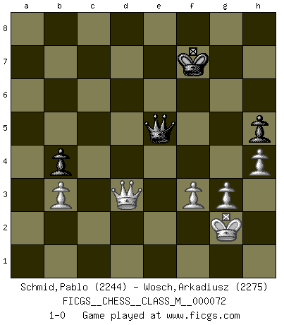 Last move : 1-0 2016 February 26 7:22:30 [Event "FICGS__CHESS__CLASS_M__000072"] [Site "FICGS"] [Date "2015.05.18"] [Round "1"] [White "Schmid,Pablo"] [Black "Wosch,Arkadiusz"] [Result "1-0"] [WhiteElo "2244"] [BlackElo "2275"] 1.d4 Nf6 2.c4 e6 3.Nf3 d5 4.Nc3 c6 5.Bg5 h6 6.Bh4 dxc4 7.e4 g5 8.Bg3 b5 9.Be2 Bb7 10.O-O Nbd7 11.Ne5 Bg7 12.Nxd7 Nxd7 13.Bd6 a6 14.a4 e5 15.Bg4 exd4 16.e5 c5 17.Re1 Nxe5 18.Bxe5 O-O 19.Bxg7 Kxg7 20.Ne2 f5 21.Bh5 f4 22.Nxd4 cxd4 23.Re6 Bc8 24.Rg6+ Kh7 25.axb5 Ra7 26.Rc6 d3 27.Qd2 Rf6 28.Rxc4 g4 29.Rac1 Bf5 30.Rxf4 axb5 31.Bxg4 Bg6 32.h3 Qd6 33.Rxf6 Qxf6 34.Bd1 Qe5 35.h4 h5 36.g3 Ra2 37.Rb1 Ra7 38.Bf3 Rf7 39.Re1 Qc5 40.Bd1 Qd6 41.Bb3 Re7 42.Rxe7+ Qxe7 43.Qf4 Kg7 44.Qd4+ Kh7 45.Kg2 Bf5 46.Bd5 Qd7 47.b3 b4 48.Kf1 Qe7 49.Qe3 Qf6 50.Be4 Qa1+ 51.Kg2 Qe5 52.Bxf5+ Qxf5 53.Qe7+ Kg8 54.Qd8+ Kf7 55.f3 Qe5 56.Qxd3 1-0 Queen's pawn game Kingside Castling by player White (move 10) Kingside Castling by player Black (move 18) 10 pieces endgame at move 56 : White KQPPPP , Black KQPP WHITE : King + 1 Queen 4 Pawns BLACK : King + 1 Queen 2 Pawns Player White won this chess game. Follow this game move after move (download)Chess is a cold bath for the mind. (Sir John Simon) Ohne Leiden bildet sich kein Charakter. (Ernst Freiherr von Feuchtersleben) Aquel que toma al Peón de Caballo de la Reina, se pasará la noche a dormir en la calle. (Anónimo) Aux échecs, les retours au sommet sont rares : les dommages psychologiques consécutifs à une défaite sont trop sévères. (Daily Telegraph) Internal peace cannot coexist with external war. (Don Groves)