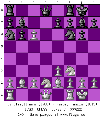 Last move : 1-0 2015 June 11 1:12:29 [Event "FICGS__CHESS__CLASS_C__000222"] [Site "FICGS"] [Date "2015.05.22"] [Round "1"] [White "Cirulis,Ilmars"] [Black "Ramos,Francis"] [Result "1-0"] [WhiteElo "1786"] [BlackElo "1615"] 1.b4 Nf6 2.Nf3 g6 3.d4 Bg7 4.Bb2 O-O 5.Nbd2 d6 6.e3 b6 7.Be2 Bb7 8.O-O c5 9.bxc5 dxc5 10.dxc5 Na6 11.c6 1-0 Polish (Sokolsky) opening Kingside Castling by player Black (move 4) Kingside Castling by player White (move 8) Player White won this chess game. Follow this game move after move (download)Chess demands total concentration. (Bobby Fischer) Ich kenne Menschen, die allen Willen der Welt besitzen und doch nicht Schach spielen können. (Robert James Fischer) Robert Fischer es la ley hacia si mismo. (Larry Evans) Toutes les manuvres exécutées sur une colonne ouverte ont pour but ultime l'intrusion définitive sur la septième ou la huitième rangée, en plein cur de la position ennemie. (Aaron Nimzovitch) If you are good, you will be assigned all the work. If you are really good, you will get out of it. (Dan Rotaru)