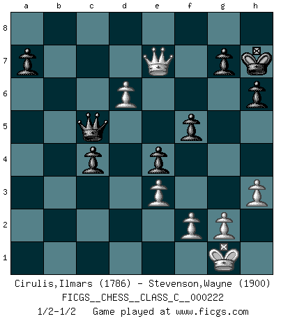 Last move : 1/2-1/2 2015 July 14 18:13:10 [Event "FICGS__CHESS__CLASS_C__000222"] [Site "FICGS"] [Date "2015.05.22"] [Round "1"] [White "Cirulis,Ilmars"] [Black "Stevenson,Wayne"] [Result "1/2-1/2"] [WhiteElo "1786"] [BlackElo "1900"] 1.b4 e6 2.a3 d5 3.e3 c5 4.bxc5 Bxc5 5.d4 Bd6 6.Nf3 Nc6 7.c4 Nf6 8.Nbd2 b6 9.cxd5 exd5 10.Bb5 Bd7 11.O-O O-O 12.a4 Qe7 13.Bxc6 Bxc6 14.Qb3 Bd7 15.Ba3 Bxa3 16.Rxa3 Rac8 17.Rfa1 Rc7 18.a5 b5 19.Ne5 Ne4 20.Nxe4 dxe4 21.Nxd7 Qxd7 22.Qb1 Rfc8 23.a6 Rc4 24.Rb3 h6 25.h3 f5 26.Qe1 Rb8 27.Rb4 Qc6 28.Rab1 Rb6 29.Rxc4 bxc4 30.d5 Qc5 31.Rxb6 Qxb6 32.Qc3 Qxa6 33.Qe5 Qc8 34.d6 Kh7 35.Qe7 Qc5 36.Qc7 Qe5 37.Qe7 Qc5 38.Qc7 Qe5 39.Qe7 Qc5 1/2-1/2 Polish (Sokolsky) opening Kingside Castling by player White (move 11) Kingside Castling by player Black (move 11) This chess game ended in a draw. Follow this game move after move (download)Chess is not like life... it has rules ! (Mark Pasternak) Mutter, ich bin eben Ex-Weltmeister geworden. --beim nach Hause Kommen nach dem Verlust des WM-Titels an Mihail Botvinnik -- (Mikhail Nekhemyevich Tal) Hay dos clases de hombres: aquellos que se conforman en dejarse llevar por las circunstancias y que juegan barajas y aquellos decididos a controlar las circunstancias y que juegan al Ajedrez. (Mortimer Collins) Je ne crois pas en la psychologie, je crois aux bons coups. (Robert Fischer) Locking firmely the window serves nothing, only small thiefs pass through there, the big thiefs enter through the front door. (Luc-Olivier Leclerc)