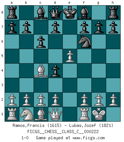 Last move : 1-0 2015 July 8 15:32:12 [Event "FICGS__CHESS__CLASS_C__000222"] [Site "FICGS"] [Date "2015.05.22"] [Round "1"] [White "Ramos,Francis"] [Black "Lubas,Jozef"] [Result "1-0"] [WhiteElo "1615"] [BlackElo "1821"] 1.e4 e5 2.Nf3 Nc6 3.Bb5 Nd4 4.Nxd4 exd4 5.O-O c6 6.Bc4 Nf6 7.e5 1-0 This chess game has been lost on time (started : 2015.05.22 9:40:11) Ruy Lopez : Bird's defense Kingside Castling by player White (move 5) Player White won this chess game. Follow this game move after move (download)Chess is a more highly symbolic game, but the aggressions are therefore even more frankly represented in the play. It probably began as a war game; that is, the representation of a miniature battle between the forces of two kingdoms. (Karl Meninger) Kostenjuk hat keinen Sexappeal. (Loek van Wely) Hasta este punto, las blancas han seguido un análisis bien conocido. Pero ahora el hace un error fatal: empieza a usar su propia cabeza. (Siegbert Tarrasch) La vérité est comme le meilleur coup aux échecs : elle existe, mais il faut la chercher. (Arturo Perez-Reverte) Now the reason the enlightened prince and the wise general conquer the enemy whenever they move and their achievements surpass those of ordinary men is foreknowledge. (Sun Tzu)