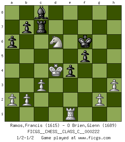 Last move : 1/2-1/2 2015 July 9 8:31:35 [Event "FICGS__CHESS__CLASS_C__000222"] [Site "FICGS"] [Date "2015.05.22"] [Round "1"] [White "Ramos,Francis"] [Black "O Brien,Glenn"] [Result "1/2-1/2"] [WhiteElo "1615"] [BlackElo "1689"] 1.e4 e5 2.Nf3 Nc6 3.Bb5 a6 4.Ba4 Nf6 5.O-O Be7 6.c3 Nxe4 7.Qe2 Nf6 8.Nxe5 Nxe5 9.Qxe5 O-O 10.h3 Re8 11.d4 Bf8 12.Qg3 Ne4 13.Qf4 Bd6 14.Qf3 Qf6 15.Qxf6 Nxf6 16.Nd2 c6 17.Nf3 Bc7 18.Be3 d5 19.Rfe1 Bf5 20.Rad1 Ne4 21.Bb3 Rad8 22.Nh4 Bd7 23.Bc2 f5 24.f4 g5 25.fxg5 Bg3 26.Nf3 Bxe1 27.Rxe1 Re7 28.Ne5 Rf8 29.g6 Bc8 30.Bh6 Rfe8 31.Bxe4 dxe4 32.Bg5 Kg7 33.Bxe7 Rxe7 34.gxh7 Kxh7 35.Kf2 c5 36.Ke3 cxd4+ 37.Kxd4 Kg7 38.Nc4 Kf6 39.Nd6 Rd7 40.Kc5 Rc7+ 41.Kd4 Rd7 42.Kc5 Rc7+ 43.Kd4 1/2-1/2 Ruy Lopez : Closed defense Kingside Castling by player White (move 5) Kingside Castling by player Black (move 9) This chess game ended in a draw. Follow this game move after move (download)Fischer was a master of clarity and a king of artful positioning. His opponents would see where he was going but were powerless to stop him. (Bruce Pandolfini) Kein Schachspieler kann gut schlafen. (H. G. Wells) Un Peón pasado aumenta su poder a medida de que el número de piezas en el tablero disminuye. (Capablanca) Aux échecs, l'amour-propre est satisfait quand on remporte la victoire, mais il n'y a pas de honte à être battu. (Benjamin Franklin) There are two types of people in this world, good and bad. The good sleep better, but the bad seem to enjoy the waking hours much more. (Woody Allen)