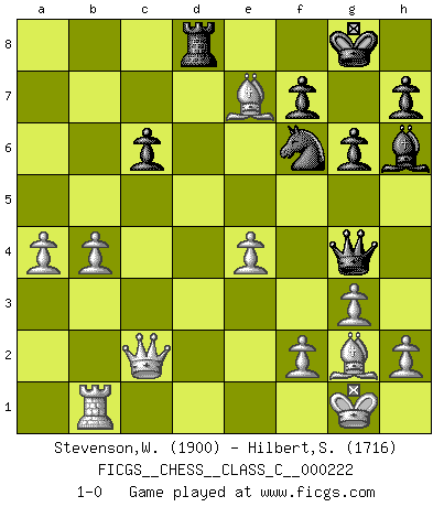 Last move : 1-0 2015 October 23 18:42:7 [Event "FICGS__CHESS__CLASS_C__000222"] [Site "FICGS"] [Date "2015.05.22"] [Round "1"] [White "Stevenson,Wayne"] [Black "Hilbert,Stephan J."] [Result "1-0"] [WhiteElo "1900"] [BlackElo "1716"] 1.c4 d6 2.g3 g6 3.Bg2 Bg7 4.Nc3 Nf6 5.Nf3 O-O 6.O-O e5 7.d3 c6 8.Rb1 a5 9.Be3 Na6 10.Qb3 Rb8 11.Bb6 Qe7 12.Bxa5 Nc5 13.Qc2 Bf5 14.a4 e4 15.Nd4 exd3 16.Nxf5 Qe5 17.exd3 Qxf5 18.Bc7 Rbc8 19.Bxd6 Rfd8 20.Ne4 Ncxe4 21.dxe4 Qe6 22.c5 b6 23.Rfd1 bxc5 24.Bxc5 Qg4 25.Rxd8+ Rxd8 26.b4 Bh6 27.Be7 1-0 English Opening Kingside Castling by player Black (move 5) Kingside Castling by player White (move 6) Player White won this chess game. Follow this game move after move (download)All Chess players should have a hobby. (Savielly Tartakower) Wenn Du einsam bist, wenn Du Dich in der Welt wie ein Fremder fühlst, spiele Schach. Das wird Deinen Geist erheben und Dein Ratgeber im Kampf sein. (Aristoteles) Siempre es mucho mejor sacrificar las piezas de tu oponente. (Savielly Tartakover) Le thème de l'attaque double intervient d'une manière ou d'une autre dans l'immense majorité des combinaisons. (Youri Averbakh) A cynic is a man who knows the price of everything but the value of nothing. (Oscar Wilde)