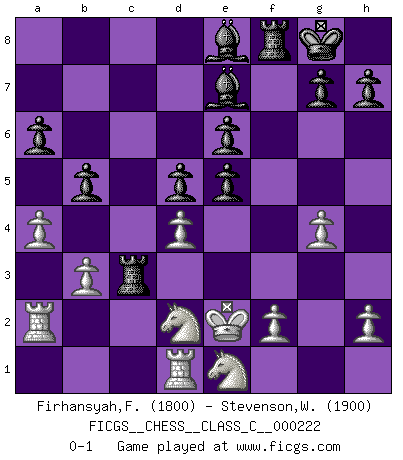 Last move : 0-1 2015 October 3 0:2:58 [Event "FICGS__CHESS__CLASS_C__000222"] [Site "FICGS"] [Date "2015.05.22"] [Round "1"] [White "Firhansyah,Firhan"] [Black "Stevenson,Wayne"] [Result "0-1"] [WhiteElo "1800"] [BlackElo "1900"] 1.e4 e6 2.d4 d5 3.e5 c5 4.Nf3 Nc6 5.Bb5 Bd7 6.Bxc6 Bxc6 7.Be3 Qb6 8.b3 cxd4 9.Bxd4 Qa6 10.Qe2 Qxe2+ 11.Kxe2 Bb5+ 12.Ke3 Nh6 13.c3 Be7 14.a4 Nf5+ 15.Kd2 Bc6 16.Na3 O-O 17.g4 Nxd4 18.cxd4 f6 19.Ke2 Rac8 20.Rhd1 a6 21.Nb1 b5 22.Nbd2 Be8 23.Ra2 Rc3 24.Ne1 fxe5 0-1 This chess game has been lost on time (started : 2015.05.22 9:40:11) French : Advance, Nimzovich system Kingside Castling by player Black (move 16) Player Black won this chess game. Follow this game move after move (download)It was clear to me that the vulnerable point of the American Grandmaster (Bobby Fischer) was in double-edged, hanging, irrational positions, where he often failed to find a win even in a won position. (Efim Geller) Ich trinke, ich rauche, ich spiele, ich liebe Frauen aber Fernschach ist ein Laster, das ich nicht habe. (Mikhail Nekhemyevich Tal) ¿Quién es tu oponente esta tarde? Esta tarde mi oponente son las piezas negras. (Akiba Rubinstein) D'abord les bases : Jouez et étudiez, puis étudiez et jouez, ensuite jouez et étudiez, puis étudiez et jouez. Deuxièmement : Donnez toujours le meilleur de vous-même ! (Ken Smith) To err is human, but to really foul things up requires a computer. (Farmer's Almanac, 1978)