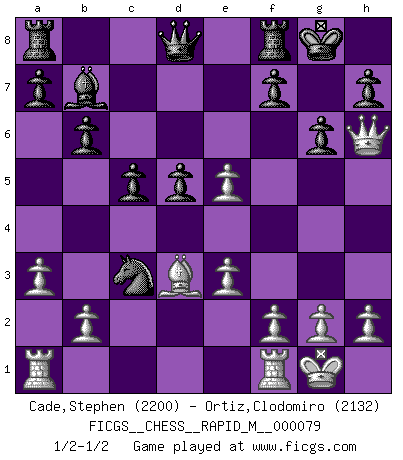 Last move : 1/2-1/2 2015 June 2 12:25:46 [Event "FICGS__CHESS__RAPID_M__000079"] [Site "FICGS"] [Date "2015.05.23"] [Round "1"] [White "Cade,Stephen"] [Black "Ortiz,Clodomiro"] [Result "1/2-1/2"] [WhiteElo "2200"] [BlackElo "2132"] 1.d4 Nf6 2.c4 e6 3.Nc3 Bb4 4.e3 O-O 5.Bd3 c5 6.Nf3 d5 7.O-O b6 8.cxd5 exd5 9.Ne5 Bb7 10.Bd2 Nc6 11.a3 Nxe5 12.dxe5 Bxc3 13.Bxc3 Ne4 14.Qh5 g6 15.Qh6 Nxc3 1/2-1/2 Nimzo-Indian : 4.e3 O-O, 5.Bd3 Kingside Castling by player Black (move 4) Kingside Castling by player White (move 7) This chess game ended in a draw. Follow this game move after move (download)You need not play well - just help your opponent to play badly. (Genrikh Chepukaitis) Ich verachte Kasparow. (Viktor Kortschnoi) El Ajedrez detiene a su maestro dentro de sus propios vínculos, encadenando la mente y el cerebro, por lo que la libertad interior del mas fuerte debe sufrir. (Albert Einstein) Ce qui caractérise les parties de combat, c'est que si le défenseur a constamment de difficiles problèmes à résoudre, l'attaquant doit chercher sans relâche de nouvelles possibilités d'attaque. (Koblentz) The arrogant army will lose certainly the battle. (Chinese proverb)