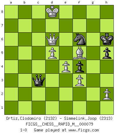 Last move : 1-0 2015 September 18 23:10:55 [Event "FICGS__CHESS__RAPID_M__000079"] [Site "FICGS"] [Date "2015.05.23"] [Round "1"] [White "Ortiz,Clodomiro"] [Black "Simmelink,Joop"] [Result "1-0"] [WhiteElo "2132"] [BlackElo "2313"] 1.d4 Nf6 2.c4 g6 3.Nc3 Bg7 4.e4 d6 5.Bd3 Nc6 6.Nge2 Nd7 7.Be3 e5 8.d5 Nd4 9.Bb1 Nxe2 10.Qxe2 O-O 11.O-O a5 12.Bc2 Nc5 13.a3 f5 14.f3 f4 15.Bf2 g5 16.b4 Nd7 17.c5 Nf6 18.bxa5 Rxa5 19.cxd6 cxd6 20.Rfb1 Ra8 21.Na4 g4 22.Nb6 Rb8 23.Nxc8 Qxc8 24.Bd3 gxf3 25.gxf3 Kh8 26.Kh1 Rg8 27.Rg1 Qh3 28.Qd1 Rbc8 29.a4 Nd7 30.Bf1 Qh5 31.Rb1 Rc7 32.Be1 Nf6 33.Ba5 Rf7 34.Rc1 R7f8 35.Rc4 Qh6 36.Bd2 Qh5 37.Bb4 Ne8 38.a5 Bf6 39.Rxg8+ Rxg8 40.Bg2 Bd8 41.Rc8 Qh4 42.Rb8 Qe7 43.Bh3 Ng7 44.Qc1 Qh4 45.Qf1 Qe7 46.Qb5 Qh4 47.Bg2 Qg5 48.Bxd6 Ne8 49.Bxe5+ Qxe5 50.Rxd8 Qa1+ 51.Qf1 Qxa5 52.Rd7 b5 53.Bh3 Qc3 54.Be6 Nf6 55.Ra7 Rd8 56.Kg2 b4 57.Qf2 Rf8 58.Ra6 h5 59.Rc6 Qe5 60.Qc5 Qb2+ 61.Qc2 Qe5 62.Rc8 Rxc8 63.Qxc8+ Kg7 64.Qb7+ Kh6 65.Qxb4 Nh7 66.Bf5 Qg7+ 67.Kf1 Qa1+ 68.Ke2 Qa2+ 69.Kd3 Qa6+ 70.Qc4 Qa1 71.Qc6+ Nf6 72.Qd6 Qf1+ 73.Kd4 Qa1+ 74.Kc5 Qc3+ 75.Kb6 Qb2+ 76.Kc7 Qc3+ 77.Kd8 1-0 This chess game has been lost on time (started : 2015.05.23 2:4:52) Comment by player 1 : Clodomiro Ortiz : my engine has said ckmate in 19,but black player,maybe,prefers passing by 51 days to lose on time,,,, King's Indian : 4.e4 Kingside Castling by player Black (move 10) Kingside Castling by player White (move 11) Player White won this chess game. Follow this game move after move (download)The tactician knows what to do when there is something to do; whereas the strategian knows what to do when there is nothing to do. (Gerald Abrahams) Es ist im Leben wie im Schachspiel. Wir entwerfen einen Plan, dieser bleibt jedoch bedingt durch das, was im Schachspiel dem Gegner, im Leben dem Schicksal zu tun belieben wird. (Arthur Schopenhauer) El juego de Damas es para vagabundos. (Paul Morphy) Les Cavaliers se révèlent fort utiles dans les positions fermées. D'habitude, les Fous sont un peu plus forts que les Cavaliers dans les positions ouvertes. Qu'on le veuille ou non, il restera toujours des exceptions ! I find television to be very educating. Every time somebody turns on the set, I go in the other room and read a book. (Groucho Marx)