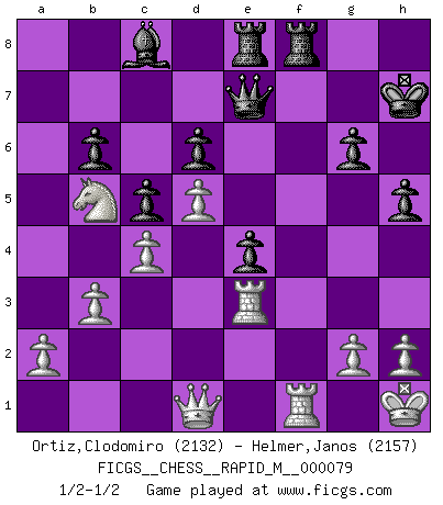 Last move : 1/2-1/2 2015 July 2 2:28:9 [Event "FICGS__CHESS__RAPID_M__000079"] [Site "FICGS"] [Date "2015.05.23"] [Round "1"] [White "Ortiz,Clodomiro"] [Black "Helmer,Janos"] [Result "1/2-1/2"] [WhiteElo "2132"] [BlackElo "2157"] 1.d4 Nf6 2.c4 g6 3.Nc3 Bg7 4.e4 d6 5.Bd3 O-O 6.Nge2 Nc6 7.O-O e5 8.d5 Nd4 9.Bg5 h6 10.Be3 Ng4 11.Bd2 c5 12.f3 Nf6 13.Rb1 b6 14.Qc1 Kh7 15.Be3 Nd7 16.Qd2 Qe7 17.Rbe1 Rb8 18.Rb1 Re8 19.Ng3 h5 20.Nge2 Bb7 21.b3 Qf8 22.Kh1 Bh6 23.f4 Qg7 24.Rf2 Rf8 25.Rbf1 Rbe8 26.fxe5 Bxe3 27.Qxe3 Nxe5 28.Qd2 Nxd3 29.Qxd3 Nxe2 30.Rxe2 f6 31.Nb5 Qe7 32.Nxa7 f5 33.Nb5 fxe4 34.Qd1 Bc8 35.Re3 1/2-1/2 King's Indian : 4.e4 Kingside Castling by player Black (move 5) Kingside Castling by player White (move 7) This chess game ended in a draw. Follow this game move after move (download)A sacrifice is best refuted by accepting it. (Wilhelm Steinitz) Über die Verhaftung Bobby Fischers: Warum es die Bush-Administration für nötig befindet einen 61 Jahre alten Mann zu hetzten, der für niemanden ausser sich selbste eine Gefahr darstellt ist ein Rätsel. (Nigel Short) La esencia del Ajedrez es pensar acerca de lo que el Ajedrez es. (David Bronstein) Même si l'adversaire joue le coup analysé précédemment, recommencez l'analyse en voyant la nouvelle position. Première règle de Blumenfeld If you are going through hell, keep going. (Winston Churchill)