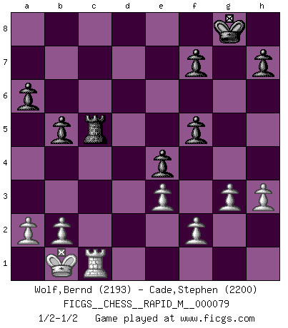 Last move : 1/2-1/2 2015 July 17 11:22:46 [Event "FICGS__CHESS__RAPID_M__000079"] [Site "FICGS"] [Date "2015.05.23"] [Round "1"] [White "Wolf,Bernd"] [Black "Cade,Stephen"] [Result "1/2-1/2"] [WhiteElo "2193"] [BlackElo "2200"] 1.d4 Nf6 2.Bg5 Ne4 3.Bf4 d5 4.e3 c5 5.Bd3 Nf6 6.c3 Nc6 7.Nd2 Bg4 8.Ngf3 e6 9.Qb3 Qc8 10.c4 dxc4 11.Bxc4 Be7 12.dxc5 O-O 13.Qa3 Rd8 14.Rc1 a6 15.Be2 b5 16.Bg5 e5 17.Bxf6 gxf6 18.Ne4 f5 19.Nd6 Qe6 20.Rd1 e4 21.Nd4 Nxd4 22.Rxd4 Bxe2 23.Kxe2 Qg6 24.Rg1 Bxd6 25.Rxd6 Qg4+ 26.Kd2 Rac8 27.h3 Qh4 28.g3 Qf6 29.Rxd8+ Qxd8+ 30.Kc2 Qf8 31.Kb1 Qxc5 32.Qxc5 Rxc5 33.Rc1 1/2-1/2 Trompowsky attack (Ruth, Opovcensky Opening) Kingside Castling by player Black (move 12) This chess game ended in a draw. Follow this game move after move (download)I thought the most common mistake [in chess] was the first one: Learning the game :P (Garvin Gray, FICGS forum) Als er Schachweltmeister wurde ließ er praktisch alle stärksten Sovietspieler für sich arbeiten. Wenn ein auch nur mittelmässiger Meister ein Spezialist für eine bestimmte Eröffnung war, wurde er von Karpov gerufen. Das wurde alles geheim gehalten. (Mikhail Moiseyevich Botvinik) Me siento como si fuera una pieza en una partida de Ajedrez, cuando mi oponente me indica: esa pieza no puede ser movida. (Soren Kierkegaard) La menace est plus forte que l'exécution. (Aaron Nimzovitch) Hardware: the parts of a computer that can be kicked. (Jeff Persis)