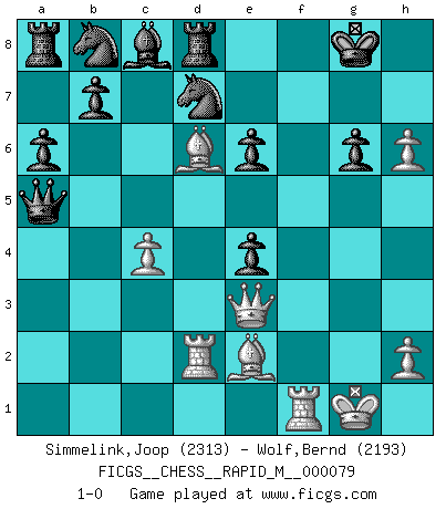 Last move : 1-0 2015 June 26 12:44:53 [Event "FICGS__CHESS__RAPID_M__000079"] [Site "FICGS"] [Date "2015.05.23"] [Round "1"] [White "Simmelink,Joop"] [Black "Wolf,Bernd"] [Result "1-0"] [WhiteElo "2313"] [BlackElo "2193"] 1.e4 c5 2.Nf3 d6 3.d4 cxd4 4.Nxd4 Nf6 5.Nc3 a6 6.Bg5 e6 7.f4 Qb6 8.Qd2 Qxb2 9.Rb1 Qa3 10.e5 dxe5 11.fxe5 Nfd7 12.Ne4 h6 13.Bh4 Qxa2 14.Rd1 Qd5 15.Qe3 Qxe5 16.Be2 Bc5 17.Bg3 Qd5 18.c4 Bxd4 19.Rxd4 Qa5+ 20.Rd2 O-O 21.Bd6 Rd8 22.g4 f5 23.g5 fxe4 24.gxh6 g6 25.O-O 1-0 Joop Simmelink thanks for the game! Sicilian : Najdorf, 7...Qb6 Kingside Castling by player Black (move 20) Kingside Castling by player White (move 25) Player White won this chess game. Follow this game move after move (download)The passed Pawn is a criminal, who should be kept under lock and key. Mild measures, such as police surveillance, are not sufficient. (Aaron Nimzovich) Ein Remis kann durch Wiederholung von drei Zügen oder durch einen schlechte Zug erreicht werden. (Savielly Grigorievitsch Tartakower) Todavía soy una víctima del Ajedrez. Tiene toda la belleza del arte y mucho mas. No puede ser comercializado. El Ajedrez es mas puro que el arte en su posición social. (Marcel Duchamp) On a dit que l'homme se distingue de l'animal par le fait qu'il achète plus de livres qu'il ne peut en lire. Je voudrais suggérer qu'inclure à la liste des livres quelques livres d'échecs rendrait la distinction manifeste. (Edward Lasker) Always remember that you are unique; just like everyone else. (Unknown)