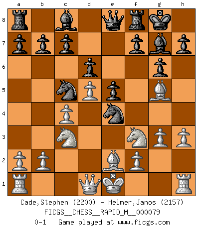 Last move : 0-1 2015 June 5 19:50:16 [Event "FICGS__CHESS__RAPID_M__000079"] [Site "FICGS"] [Date "2015.05.23"] [Round "1"] [White "Cade,Stephen"] [Black "Helmer,Janos"] [Result "0-1"] [WhiteElo "2200"] [BlackElo "2157"] 1.d4 Nf6 2.c4 g6 3.Nc3 Bg7 4.e4 d6 5.h3 O-O 6.Bg5 Na6 7.Nf3 Qe8 8.Be2 e5 9.d5 Nc5 10.g3 Nfxe4 0-1 King's Indian : Makagonov system (5.h3) Kingside Castling by player Black (move 5) Player Black won this chess game. Follow this game move after move (download)Let the perfectionist play postal. (Yasser Seirawan) Wenn Capablanka heute auf der Schachbühne erscheinen würde, hätte er ein halbes Jahr gebraucht um sich die Schachtheorie anzueignen. Und dann hätte er alles und jeden besiegt. (Mikhail Moiseyevich Botvinik) Hay dos clases de hombres: aquellos que se conforman en dejarse llevar por las circunstancias y que juegan barajas y aquellos decididos a controlar las circunstancias y que juegan al Ajedrez. (Mortimer Collins) On est toujours la mazette de quelqu'un d'autre. (Anonyme) Always two there are. No more no less. A master, and an apprentice. (Master Yoda in Star Wars ep.1)