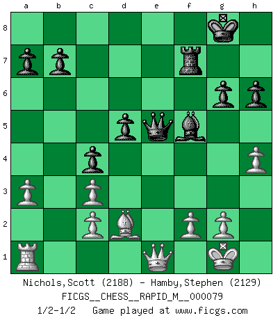 Last move : 1/2-1/2 2015 June 30 12:49:11 [Event "FICGS__CHESS__RAPID_M__000079"] [Site "FICGS"] [Date "2015.05.23"] [Round "1"] [White "Nichols,Scott"] [Black "Hamby,Stephen"] [Result "1/2-1/2"] [WhiteElo "2188"] [BlackElo "2129"] 1.e4 e6 2.d4 d5 3.Nc3 Bb4 4.e5 c5 5.a3 Bxc3+ 6.bxc3 Ne7 7.Qg4 O-O 8.Bd3 f5 9.exf6 Rxf6 10.Bg5 Rf7 11.Qh5 g6 12.Qd1 Nbc6 13.Nf3 c4 14.Be2 Qa5 15.Bd2 Nf5 16.h4 h6 17.O-O Bd7 18.Qc1 Re8 19.Re1 e5 20.dxe5 Nxe5 21.Nxe5 Rxe5 22.Bg4 Qc7 23.Rxe5 Qxe5 24.Bxf5 Bxf5 25.Qe1 1/2-1/2 French : Winawer, Advance, poisoned pawn variation Kingside Castling by player Black (move 7) Kingside Castling by player White (move 17) This chess game ended in a draw. Follow this game move after move (download)One bad move nullifies forty good ones. (Horowitz) Es genügt nicht ein guter Spieler zu sein, man muß auch gut spielen. (Siegbert Tarrasch) La mitad de las variaciones que son calculadas en una partida de torneo, resultan ser completamente superfluas. Desafortunadamente, nadie sabe por adelantado cual mitad. (Jan Tinman) J'ai toujours senti une vague pitié pour l'homme qui ne connaît rien aux échecs, tout comme j'en aurais pour un homme ignorant de l'amour. Les Echecs, comme la musique ou comme l'amour, ont le pouvoir de rendre heureux. (Siegbert Tarrasch) Life is painting a picture, not doing a sum. (Oliver Wendell Holmes, Jr.)