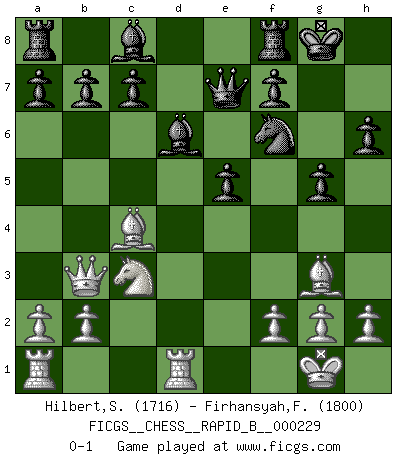 Last move : 0-1 2015 September 9 22:16:39 [Event "FICGS__CHESS__RAPID_B__000229"] [Site "FICGS"] [Date "2015.05.24"] [Round "1"] [White "Hilbert,Stephan J."] [Black "Firhansyah,Firhan"] [Result "0-1"] [WhiteElo "1716"] [BlackElo "1800"] 1.e4 e5 2.Nf3 Nc6 3.d4 exd4 4.c3 dxc3 5.Bc4 Be7 6.O-O Nf6 7.Nxc3 d6 8.e5 Nxe5 9.Nxe5 dxe5 10.Qb3 O-O 11.Rd1 Bd6 12.Bg5 h6 13.Bh4 g5 14.Bg3 Qe7 0-1 Scotch : Goering gambit Kingside Castling by player White (move 6) Kingside Castling by player Black (move 10) Player Black won this chess game. Follow this game move after move (download)Bobby Fischer is the greatest Chess genius of all time ! (Alexander Kotov) Alle Schachspieler sollten auch ein Hobby haben. (Savielly Grigorievitsch Tartakower) El Ajedrez es un cuento de Hadas de las 1001 metidas de pata. (Savielly Tartakower) Ce qui caractérise les parties de combat, c'est que si le défenseur a constamment de difficiles problèmes à résoudre, l'attaquant doit chercher sans relâche de nouvelles possibilités d'attaque. (Koblentz) Once you start thinking you have nothing left to learn, you have everything to learn. (Steve Badget)