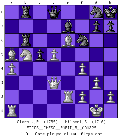 Last move : 1-0 2015 August 26 23:21:48 [Event "FICGS__CHESS__RAPID_B__000229"] [Site "FICGS"] [Date "2015.05.24"] [Round "1"] [White "Sternik,Ryszard"] [Black "Hilbert,Stephan J."] [Result "1-0"] [WhiteElo "1789"] [BlackElo "1716"] 1.Nf3 Nf6 2.c4 e6 3.d4 b6 4.g3 Bb7 5.Bg2 Be7 6.O-O O-O 7.Nc3 c5 8.d5 d6 9.dxe6 fxe6 10.Bh3 Bxf3 11.Bxe6+ Kh8 12.exf3 Nbd7 13.f4 a6 14.Re1 Ng8 15.Qd3 Ndf6 16.b3 Rb8 17.Bb2 d5 18.cxd5 b5 19.Re2 Bd6 20.a4 bxa4 21.bxa4 Qc7 22.Qxa6 Rb6 23.Qd3 Rfb8 24.Nb5 Qd8 25.Bc3 Be7 26.Ba5 1-0 Reti Opening Kingside Castling by player White (move 6) Kingside Castling by player Black (move 6) Player White won this chess game. Follow this game move after move (download)The older I grow, the more I value pawns. (Paul Keres) Bobby Fischer ist kein Vorbild für die heutige Jugend. (Viktor Kortschnoi) Fischer es una tragedia del Ajedrez Americano a la par con Morphy y Pillsbury. (Mig Greengard) Un millionnaire : 'Monsieur Steinitz ! Vous ne participez aux tournois que pour l'argent, alors que moi je n'y viens que pour l'honneur.' Steinitz : 'Chacun joue pour ce qu'il n'a pas'... Perfection is achieved, not when there is nothing more to add, but when there is nothing left to take away. (Antoine de Saint-Exupéry)
