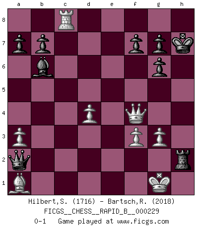 Last move : 0-1 2015 July 26 23:45:23 [Event "FICGS__CHESS__RAPID_B__000229"] [Site "FICGS"] [Date "2015.05.24"] [Round "1"] [White "Hilbert,Stephan J."] [Black "Bartsch,Reinhard Andrea"] [Result "0-1"] [WhiteElo "1716"] [BlackElo "2018"] 1.b4 e5 2.Bb2 Bxb4 3.Bxe5 Nf6 4.c4 d6 5.Bb2 Bf5 6.a3 Ba5 7.e3 Nbd7 8.Nf3 Nc5 9.Nd4 Bg6 10.Nb3 Bb6 11.Nxc5 Bxc5 12.d4 Bb6 13.Nc3 O-O 14.Bd3 c6 15.O-O Rc8 16.Bxg6 hxg6 17.Qf3 d5 18.cxd5 Nxd5 19.Nxd5 cxd5 20.Rac1 Qd7 21.e4 dxe4 22.Qxe4 Rxc1 23.Rxc1 Re8 24.Qf4 Qb5 25.Ba1 Qa5 26.g3 Re1+ 27.Kg2 Qd5+ 28.f3 Re2+ 29.Kf1 Rxh2 30.Rc8+ Kh7 31.Kg1 Qa2 0-1 Polish (Sokolsky) opening Kingside Castling by player Black (move 13) Kingside Castling by player White (move 15) Player Black won this chess game. Follow this game move after move (download)Morphy was probably the greatest genius of them all. (Bobby Fischer) Gewöhnliche Menschen denken nur daran, wie sie ihre Zeit verbringen. Ein intelligenter Mensch versucht, sie auszunutzen. (Arthur Schopenhauer) Ayuda a tus piezas para que ellas te puedan ayudar. (Paul Morphy) Le jeu d'échecs fait naître et fortifie en nous plusieurs qualités précieuses dans le cours de l'existence, telles que la prévoyance, la circonspection, la prudence, et la persévérance. (Benjamin Franklin - 1783, la morale des échecs) Life is the sum of all your choices. (Albert Camus)