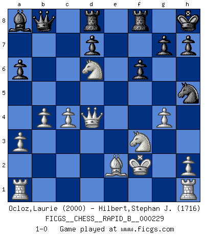 Last move : 1-0 2015 September 2 22:17:29 [Event "FICGS__CHESS__RAPID_B__000229"] [Site "FICGS"] [Date "2015.05.24"] [Round "1"] [White "Ocloz,Laurie"] [Black "Hilbert,Stephan J."] [Result "1-0"] [WhiteElo "2000"] [BlackElo "1716"] 1.d4 Nf6 2.c4 e6 3.Nf3 b6 4.a3 Bb7 5.Nc3 Be7 6.Bf4 a6 7.d5 O-O 8.e4 exd5 9.exd5 Bc5 10.Be2 c6 11.b4 Nh5 12.Bxb8 Bxf2+ 13.Kxf2 Qxb8 14.Na4 cxd5 15.Nxb6 Qa7 16.Qd4 Rad8 17.Nxd5 Qb8 18.Ne7+ Kh8 19.Nf5 f6 20.Nd6 Ba8 21.g4 1-0 Queen's Indian : Petrosian system Kingside Castling by player Black (move 7) Player White won this chess game. Follow this game move after move (download)A player surprised is half beaten. (Proverb) Im Schach gibt es keinen Platz für Galanterie. (Irving Chernev) Una buena ofensiva y una buena defensa, comienzan ambas con un buen desarrollo. (Bruce A. Moon) La menace est plus forte que l'exécution. (Aaron Nimzovitch) There are 10 types of people in this world: those who understand binary and those who don't. (Anonymous)