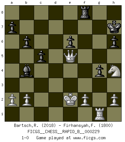 Last move : 1-0 2015 July 13 16:3:32 [Event "FICGS__CHESS__RAPID_B__000229"] [Site "FICGS"] [Date "2015.05.24"] [Round "1"] [White "Bartsch,Reinhard Andrea"] [Black "Firhansyah,Firhan"] [Result "1-0"] [WhiteElo "2018"] [BlackElo "1800"] 1.d4 d5 2.c4 e6 3.Nc3 Nf6 4.Nf3 Bb4 5.Bg5 Be7 6.e3 O-O 7.Qc2 h6 8.Bh4 b6 9.Bd3 dxc4 10.Bxc4 Ba6 11.Bxa6 Nxa6 12.e4 Bb4 13.e5 g5 14.exf6 gxh4 15.Qd3 Qxf6 16.Qxa6 h3 17.Qd3 c5 18.gxh3 Qf4 19.Rg1+ Kh8 20.Rg4 Qf6 21.Ke2 Rad8 22.Ne4 Qe7 23.Rh4 f5 24.Rg1 Qxh4 25.Nxh4 Rxd4 26.Qg3 Rxe4 27.Kf3 Rg4 28.Qe5+ Kh7 29.hxg4 fxg4 30.Ke2 1-0 QGD : Ragozin variation Kingside Castling by player Black (move 6) Player White won this chess game. Follow this game move after move (download)The isolated Pawn casts gloom over the entire chessboard. (Aaron Nimzovich) Das Schachspiel ist ein See, in welchem eine Mücke baden und ein Elefant ertrinken kann. (Emanuel Lasker) El jugador blanco perdió porque fallo en recordar la coreccta continuación y tuvo que pensar por sí mismo las movidas. (Siegbert Tarrasch) Les écrivains ont utilisé les échecs pour analyser les côtés extrêmes de la nature humaine. Dans ce cadre, les échecs offrent un champ d'expérimentation idéal. Mais on pourrait faire la même chose avec la peinture. Et là, en vous référant à Van Gogh, vous ne tirerez pas de conclusion définitive sur les peintres. (Gary Kasparov) If you ain't just a little scared when you enter a casino, you are either very rich or you haven't studied the games enough. (Pappy)