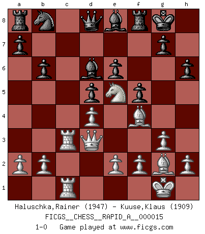 Last move : 1-0 2007 May 24 16:59:29 [Event "FICGS__CHESS__RAPID_A__000015"] [Site "FICGS"] [Date "2007.03.04"] [Round "1"] [White "Haluschka,Rainer"] [Black "Kuuse,Klaus"] [Result "1-0"] [WhiteElo "1947"] [BlackElo "1909"] 1.d4 f5 2.g3 Nf6 3.Bg2 e6 4.c4 Be7 5.Nc3 O-O 6.Nf3 c6 7.Bf4 d5 8.Qd3 Bd7 9.O-O h6 10.Rfc1 Ne4 11.Ne5 Nxc3 12.Rxc3 Be8 13.Rb3 b6 14.Rc3 Bd6 15.cxd5 cxd5 16.Rac1 1-0 This chess game has been lost on time (started : 2007.03.04 2:4:20) Dutch defense Kingside Castling by player Black (move 5) Kingside Castling by player White (move 9) Player White won this chess game. Follow this game move after move (download)We cannot resist the fascination of sacrifice, since a passion for sacrifices is part of a Chessplayer's nature. (Rudolf Spielman) Auf Remis zu spielen ist gewissermaßen ein Verbrechen gegen das Schachspiel. (Mikhail Nekhemyevich Tal) Muchos se han convertido en Maestros de Ajedrez, nadie se ha convertido en el Maestro del Ajedrez. (Siegbert Tarrasch) Il n'y a pas de prix trop élevé au scalp de l'ennemi. (Koblentz) I find your interest interesting. (Gregory House, House M.D.)