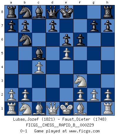 Last move : 0-1 2015 July 8 15:32:12 [Event "FICGS__CHESS__RAPID_B__000229"] [Site "FICGS"] [Date "2015.05.24"] [Round "1"] [White "Lubas,Jozef"] [Black "Faust,Dieter"] [Result "0-1"] [WhiteElo "1821"] [BlackElo "1748"] 1.e4 c5 2.c3 e6 3.d4 Nf6 4.e5 Nd5 5.c4 Nb6 6.dxc5 Bxc5 7.Nf3 f6 0-1 This chess game has been lost on time (started : 2015.05.24 12:52:43) Sicilian : Alapin's variation (2.c3) Player Black won this chess game. Follow this game move after move (download)Fischer sacrificed virtually everything most of us weakies (to use his term) value, respect, and cherish, for the sake of an artful, often beautiful board game, for the ambivalent privilege of being its greatest master. (Paul Kollar) In der Schule lernt man nichts. Es ist nur Zeitverschwendung. (Robert James Fischer) Un mal plan es mejor que no tener ningún plan. (Frank Marshall) Pour se monter efficace, un Cavalier a besoin d'avant-postes ! Les Cavaliers font les meilleurs bloqueurs de pions passés. The various flowers seem good to different people. (Chinese proverb)