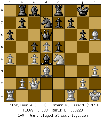 Last move : 1-0 2015 May 30 13:6:55 [Event "FICGS__CHESS__RAPID_B__000229"] [Site "FICGS"] [Date "2015.05.24"] [Round "1"] [White "Ocloz,Laurie"] [Black "Sternik,Ryszard"] [Result "1-0"] [WhiteElo "2000"] [BlackElo "1789"] 1.d4 Nf6 2.c4 c5 3.d5 d6 4.Nc3 g6 5.e4 Bg7 6.Bd3 O-O 7.h3 Nfd7 8.Nf3 Ne5 9.Nxe5 Bxe5 10.O-O Nd7 11.Bh6 Re8 12.Qc2 a6 13.f4 Bd4+ 14.Kh1 Qc7 15.a4 Rb8 16.e5 dxe5 17.f5 Qd6 18.fxg6 hxg6 19.Ne4 1-0 Benoni defense, Hromodka system Kingside Castling by player Black (move 6) Kingside Castling by player White (move 10) Player White won this chess game. Follow this game move after move (download)A good player is always lucky. (Jose Raul Capablanca) Drei Punkte vor allen anderen ist wie einer, der im weißen Anzug posiert, während der Rest in Müllsäcke gekleidet dasteht. (Viktor Kortschnoi) Ayuda a tus piezas para que ellas te puedan ayudar. (Paul Morphy) Pour moi, les échecs ne sont pas un jeu mais un art. (Alexandre Alekhine) You think that education is too expensive ? Try ignorance. (Derek Bok)