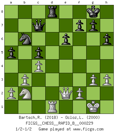 Last move : 1/2-1/2 2015 May 27 18:29:3 [Event "FICGS__CHESS__RAPID_B__000229"] [Site "FICGS"] [Date "2015.05.24"] [Round "1"] [White "Bartsch,Reinhard Andrea"] [Black "Ocloz,Laurie"] [Result "1/2-1/2"] [WhiteElo "2018"] [BlackElo "2000"] 1.d4 Nf6 2.c4 e6 3.Nf3 b6 4.g3 Ba6 5.b3 Bb4+ 6.Bd2 Be7 7.Bg2 c6 8.Bc3 d5 9.Nbd2 O-O 10.O-O Nbd7 11.Re1 Qc7 12.e4 dxe4 13.Nxe4 Rad8 14.Nxf6+ Bxf6 15.Qc2 c5 16.dxc5 bxc5 17.Bxf6 Nxf6 18.Ne5 Bb7 19.Bxb7 Qxb7 20.Rad1 Nd7 21.Nd3 Qc7 22.Qe2 h6 23.Qf3 Qa5 24.Qe2 Qc7 25.h3 a5 26.Nb2 Nb6 27.Rxd8 Rxd8 28.Rd1 1/2-1/2 Queen's Indian : Nimzovich variation (exaggerated Fianchetto) Kingside Castling by player Black (move 9) Kingside Castling by player White (move 10) This chess game ended in a draw. Follow this game move after move (download)Modern Chess is too much concerned with things like Pawn structure. Forget it, Checkmate ends the game. (Nigel Short) Ein unbeabsichtigtes Patt ist der Gipfel der Dummheit. (Anonymous) Nunca nadie ha ganado una partida de Ajedrez rindiendose. (Unknown) Les Echecs, c'est l'art de la guerre sans les charniers, c'est la résurrection des morts tombés au champ d'honneur, l'espoir perpétuel, la suprématie de l'intelligence sur la force, la culture de l'esprit. (F. Szpiner) The human is the only animal species whose members are able to talk themselves into difficulties that would not otherwise exist. (Wendell Johnson)