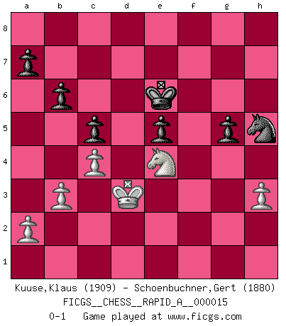 Last move : 0-1 2007 May 28 17:24:16 [Event "FICGS__CHESS__RAPID_A__000015"] [Site "FICGS"] [Date "2007.03.04"] [Round "1"] [White "Kuuse,Klaus"] [Black "Schoenbuchner,Gert"] [Result "0-1"] [WhiteElo "1909"] [BlackElo "1880"] 1.e4 e5 2.Nf3 Nc6 3.Bb5 d6 4.d4 exd4 5.Nxd4 Bd7 6.Nc3 Nxd4 7.Qxd4 Bxb5 8.Nxb5 c6 9.Nc3 Qf6 10.Qxf6 Nxf6 11.Bg5 Be7 12.O-O-O O-O-O 13.Be3 Kb8 14.f4 Ng4 15.Bd4 Bf6 16.Bxf6 Nxf6 17.Rhe1 Rhe8 18.h3 Kc7 19.e5 dxe5 20.Rxe5 Rxd1+ 21.Kxd1 Rxe5 22.fxe5 Nd7 23.e6 fxe6 24.Ne4 Nf6 25.Ng5 Kd6 26.Ke2 h6 27.Nf3 Kd5 28.Kd3 c5 29.c4+ Kd6 30.g4 b6 31.b3 g6 32.Nh4 g5 33.Nf3 e5 34.Nd2 h5 35.gxh5 Nxh5 36.Ne4+ Ke6 0-1 This chess game has been lost on time (started : 2007.03.04 2:4:20) Ruy Lopez : Old Steinitz defense Queenside Castling by player White (move 12) Queenside Castling by player Black (move 12) Player Black won this chess game. Follow this game move after move (download)The laws of Chess do not permit a free choice: you have to move whether you like it or not. (Emanuel Lasker) Ich hatte Zahnschmerzen im ersten Spiel. In der zweiten Partie tat mir der Kopf weh. In der dritten war es eine Rheuma-Attacke und während der vierten fühlte ich mich nicht gut. Und in der fünften? Nun, man muss doch nicht jedes Spiel gewinnen, oder? (Savielly Grigorievitsch Tartakower) Las combinaciones han sido siempre el aspecto más intrigante del Ajedrez. Los Maestros las buscan, el público las aplauden, los críticos las alaban. La razón se debe a que las combinaciones hacen posible que el Ajedrez sea más que un ejercicio matemático con una carencia de vida. Ellas son la poesía del juego, son del Ajedrez lo que la melodía es de la música. Ellas representan el triunfo de la mente sobre la materia. (Reuben Fine) Donnez-moi un Cavalier en 6e et je gagnerais toutes mes parties. (Steinitz) There is a very easy way to return from a casino with a small fortune : go there with a large one. (Jack Yelton)