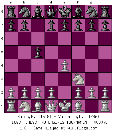 Last move : 1-0 2015 July 7 3:26:51 [Event "FICGS__CHESS__NO_ENGINES_TOURNAMENT__000078"] [Site "FICGS"] [Date "2015.05.27"] [Round "1"] [White "Ramos,Francis"] [Black "Valentin,Laurentiu"] [Result "1-0"] [WhiteElo "1615"] [BlackElo "1286"] 1.e4 c5 2.Nf3 1-0 This chess game has been lost on time (started : 2015.05.27 0:30:17) Sicilian defense Player White won this chess game. Follow this game move after move (download)In Fischer's hands, a slight theoretical advantage is as good a being a Queen ahead. (Isaac Kashdan) Ich kenne keine einzige Person, die behaupten würde, Garri Kasparow sei ein guter Mensch (Nigel Short) Tu eres para mi la Reina en d8 y yo soy el Peón en d7!!. (GM Eduard Gufeld) Il vaut toujours mieux jouer un plan faux de façon logique que de n'avoir pas de plan du tout. (Victor Kortchnoï) In God we trust, all others we virus scan. (Anonymous)